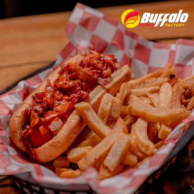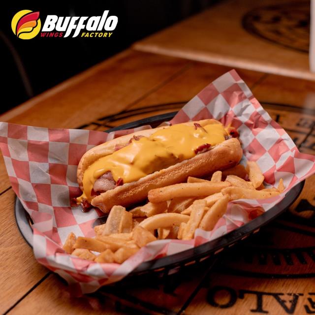 Bañado En Queso Amarillo Derretido Y Trocitos De Tocino. Lleva Salchicha De Cerdo y van Acompañados De Papas a La Francesa