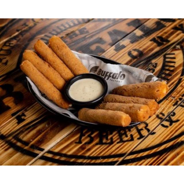 8 Crujientes Dedos De Queso Empanizados Bañados En Salsa Buffalo Y Aderezo.