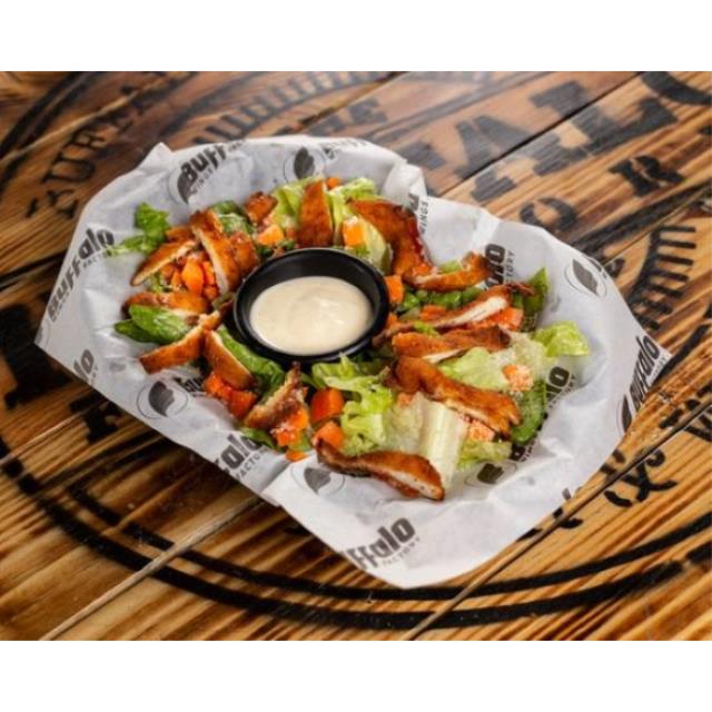 Tiras De Pollo Empanizado Con De Lechuga, Tomate, Cebolla, Apio Y Zanahoria Con Salsa Buffalo O Aderezo De La Casa.