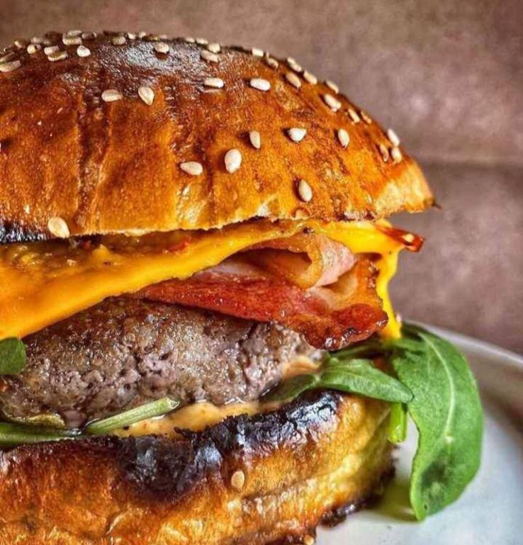 Deliciosa Hamburguesa con carne , dos quesos ,tocino , jamon, lechuga coronado con peperoni y queso gratinado