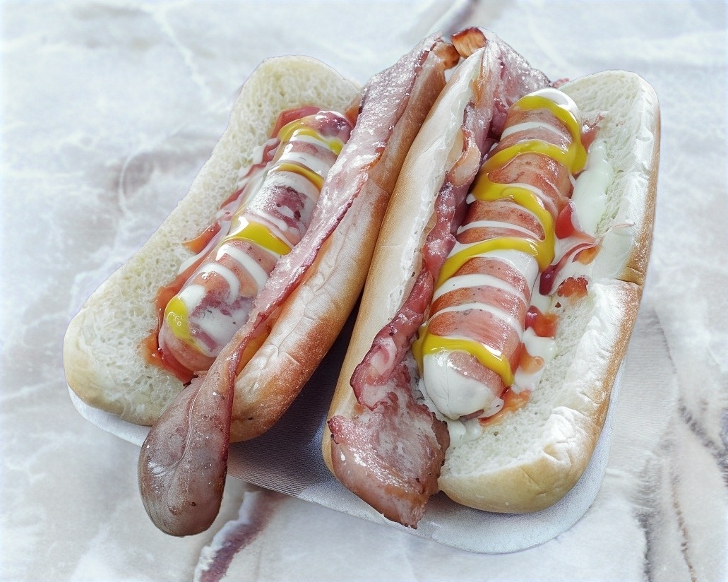 Pan, salchicha, tocino y aderezos.