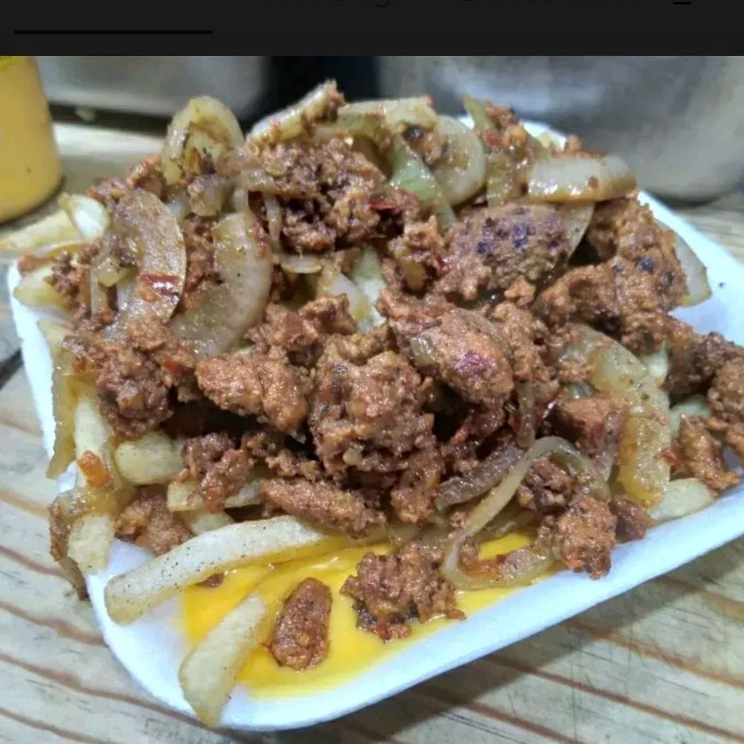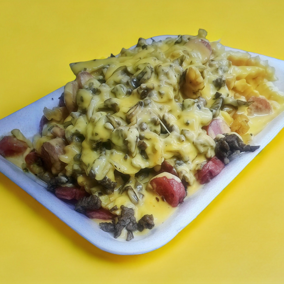 Orden de 200g de papas fritas con salchicha en rodajas onsalchicha roja para asar en cuadritos ,carne asada o pastor a elegir,bañadas con abundante queso amarillo derretido