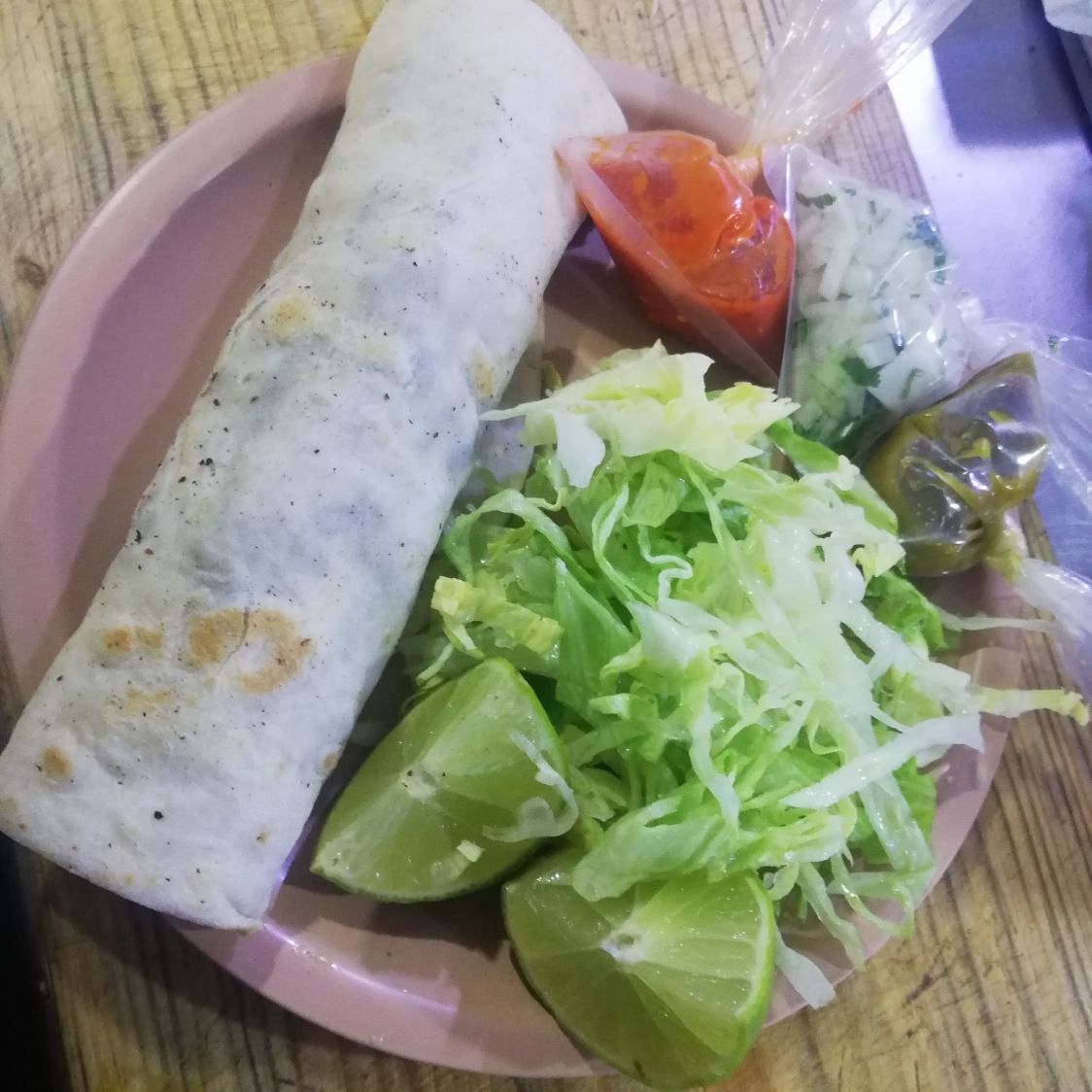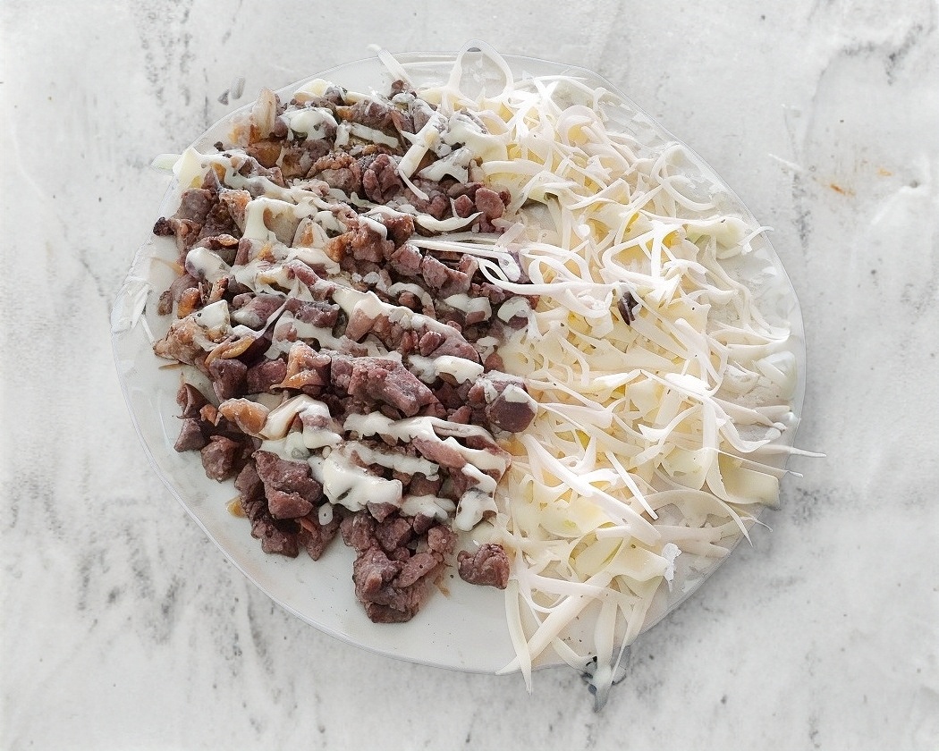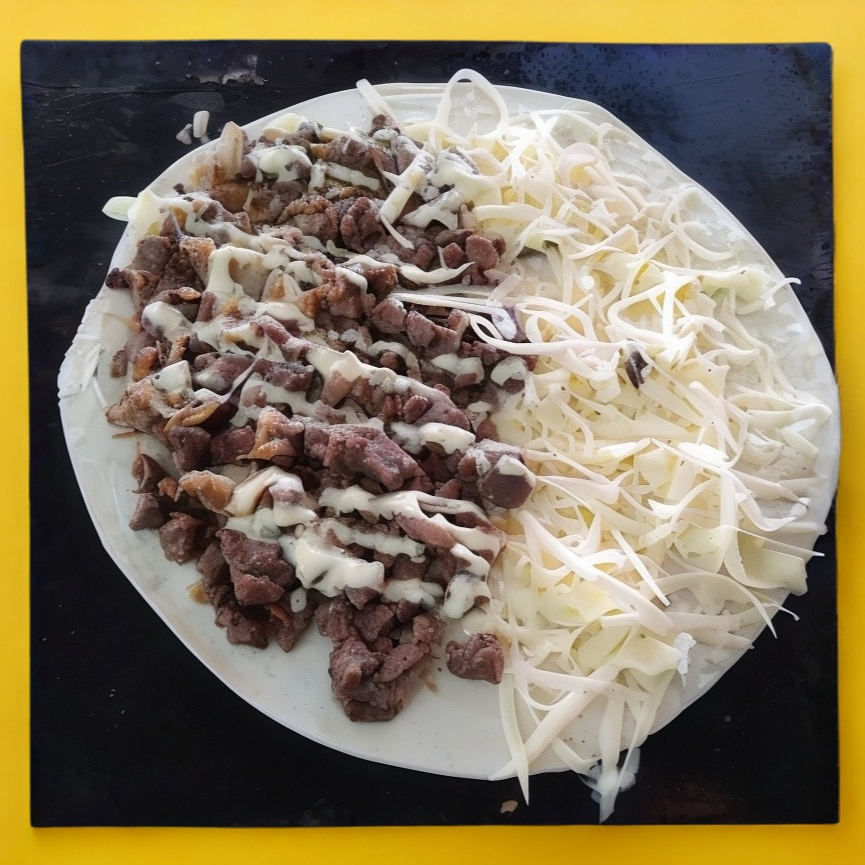 Carne de hamburgue, queso amarillo,queso blanco excélsior,salchicha y tocino picados y aderezo de la casa en tortilla de arina