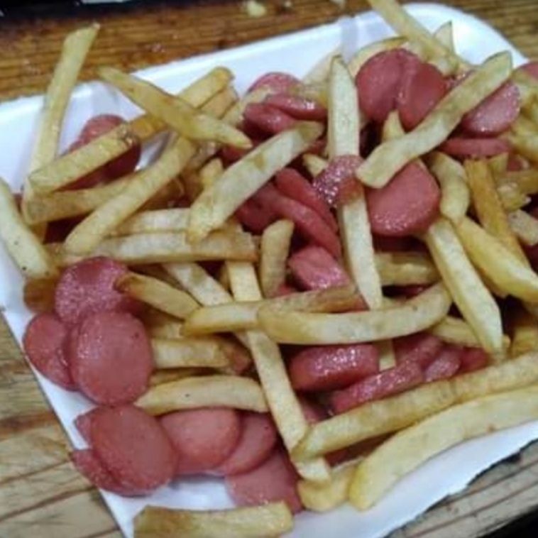 200 gramos de papas fritas salchicha en rodajas catsup aderezo