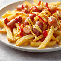 Salchichas, catsup, mayonesa, poscion carne c sirloin, tocino, 150gr. Papas a la francesa
