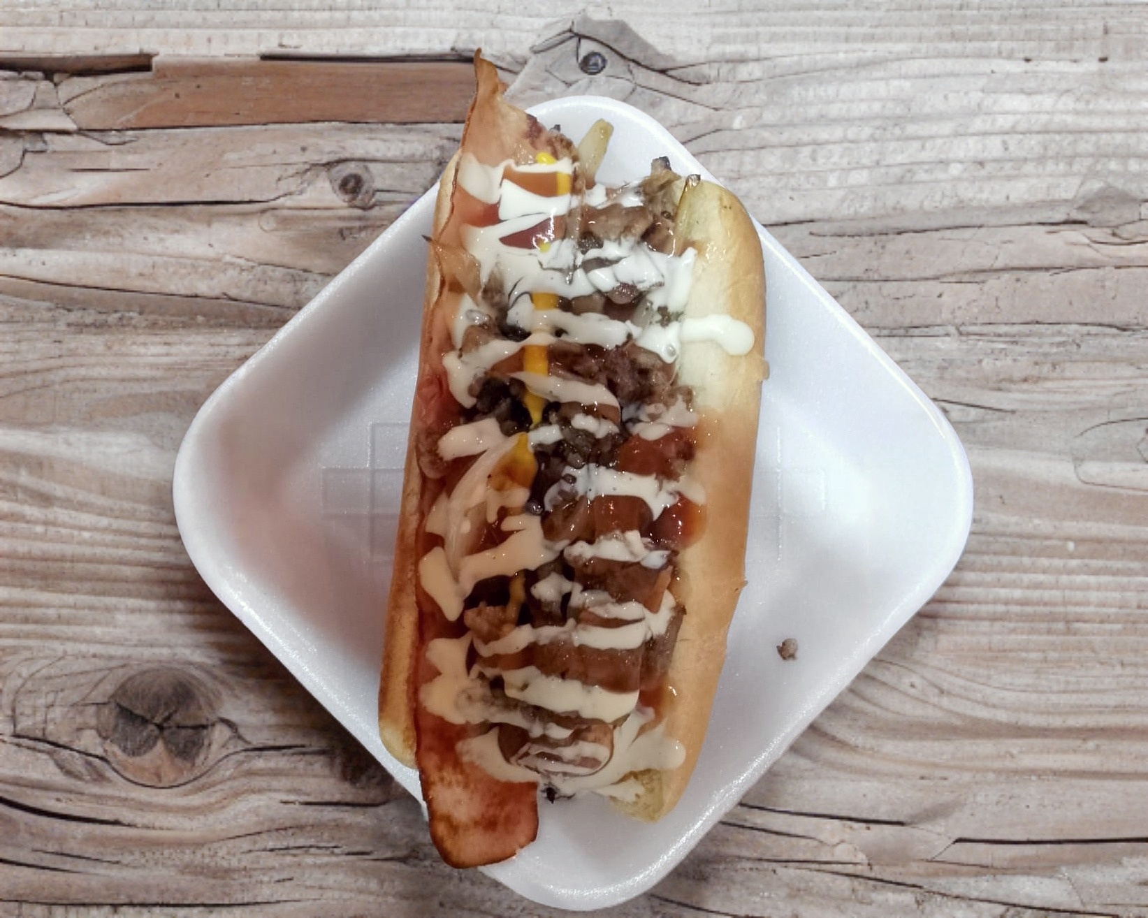 Salchicha, tocino, carne asada, cebolla asada y aderezo.