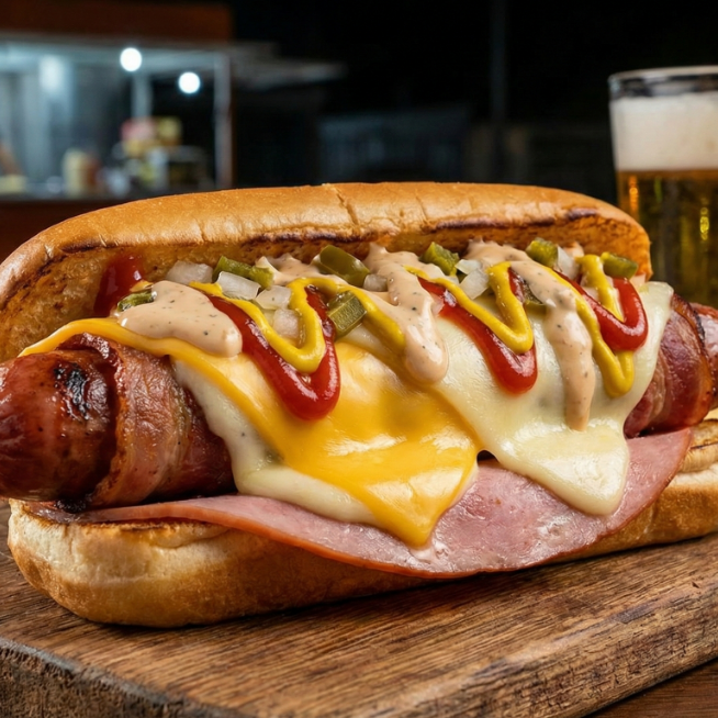 Salchicha y tocino envueltos en jamón, queso amarillo, queso blanco excelsior, aderezo de casa, cátsup, mostaza y pan.