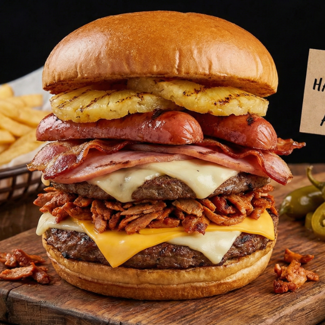 Doble carne casera más carne asada o pastor, doble jamón, doble queso amarillo, doble queso excelsior, doble tocino, doble salchicha y piña.