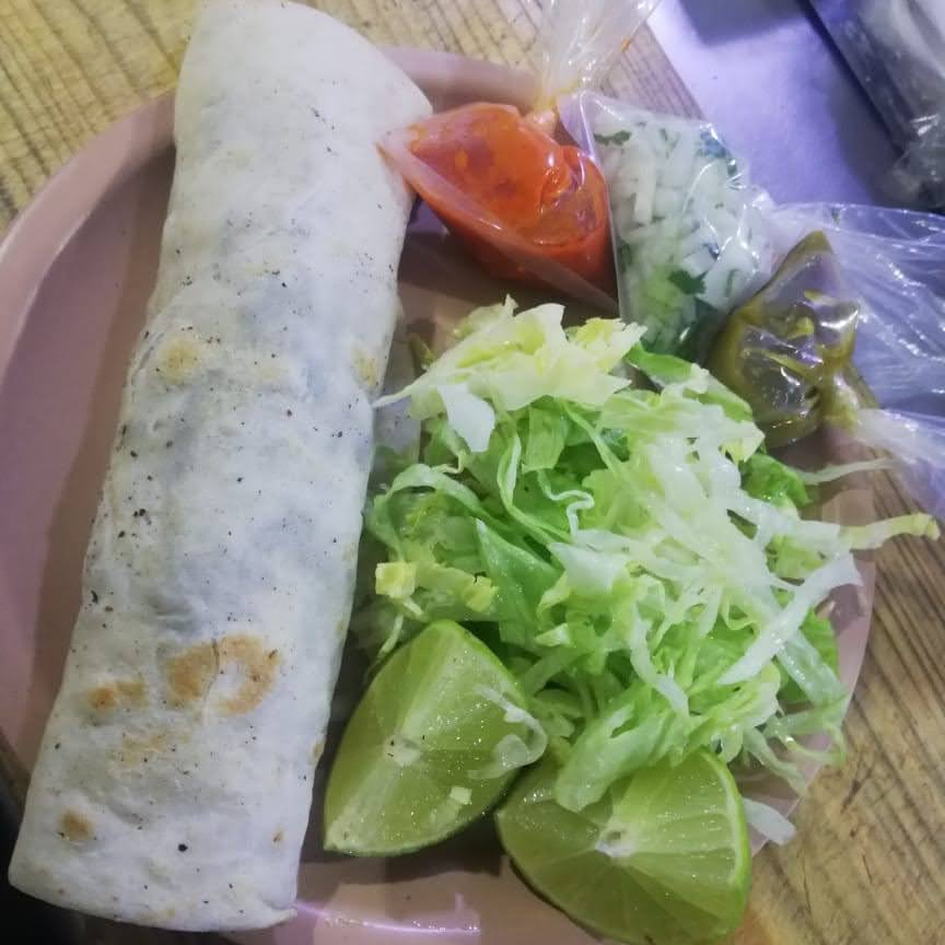 Carne de hamburguesa, queso amarillo, queso blanco excélsior, salchicha y tocino picados, aderezo de la casa en tortilla de harina.