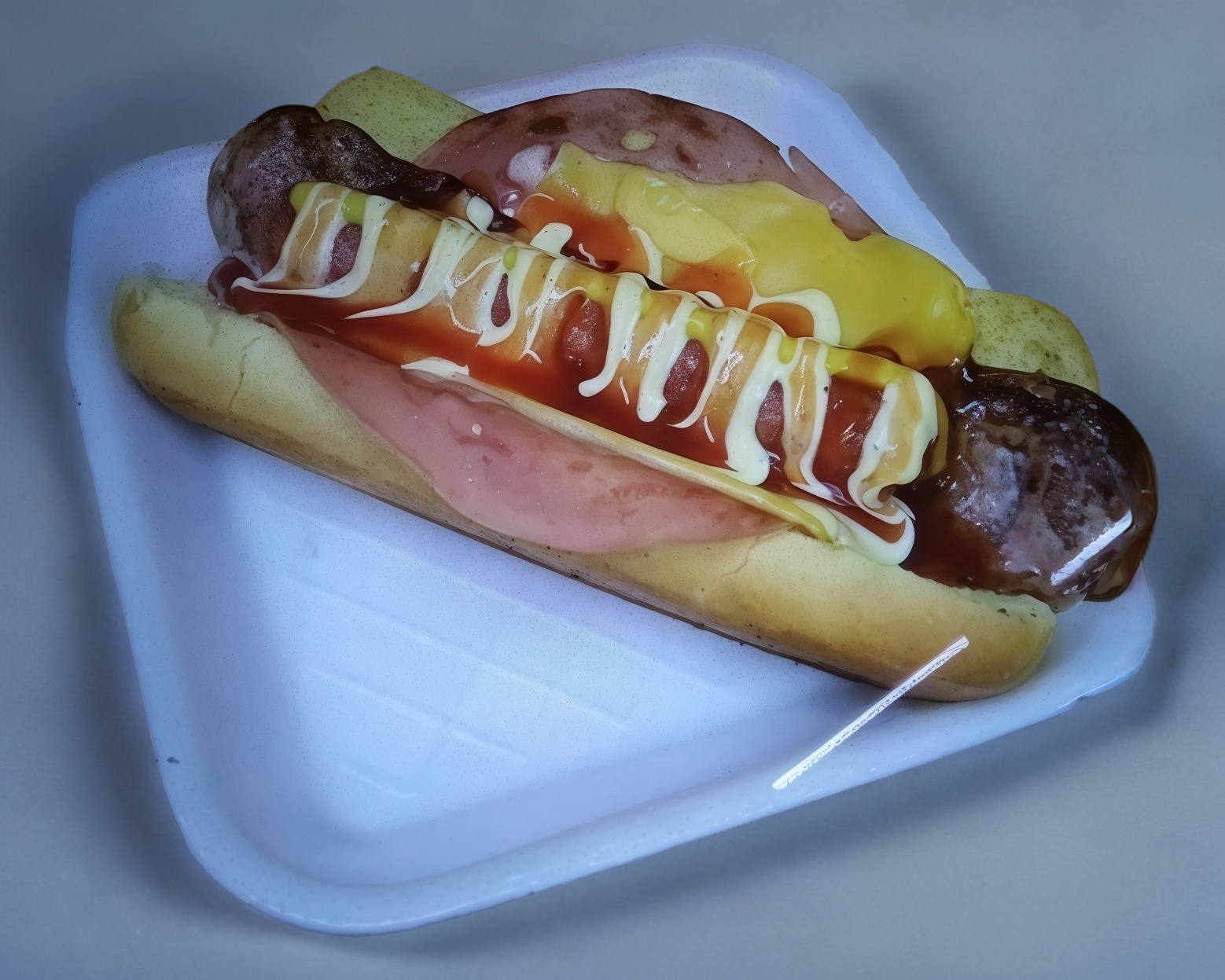 Salchicha y tocino envueltos en jamón queso amarillo queso blanco excélsior aderezo de casa catsup mostaza y pan