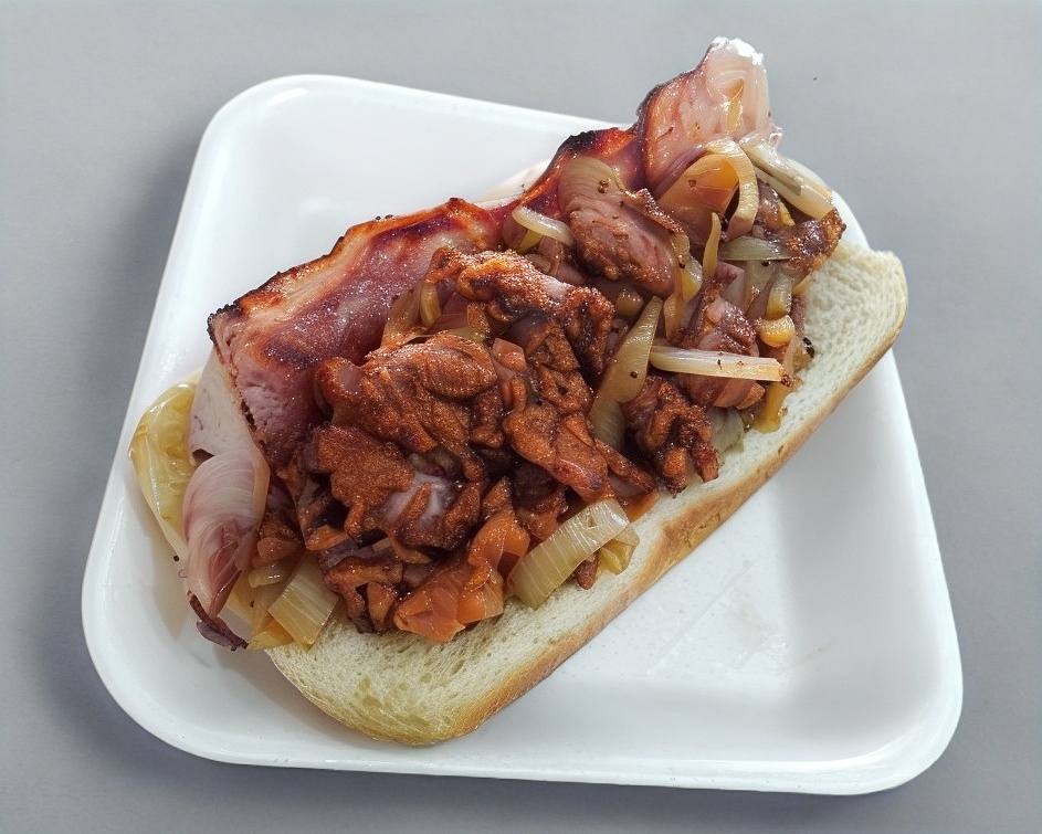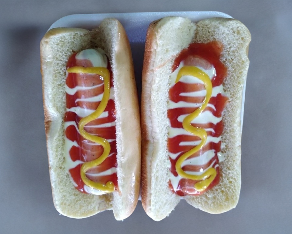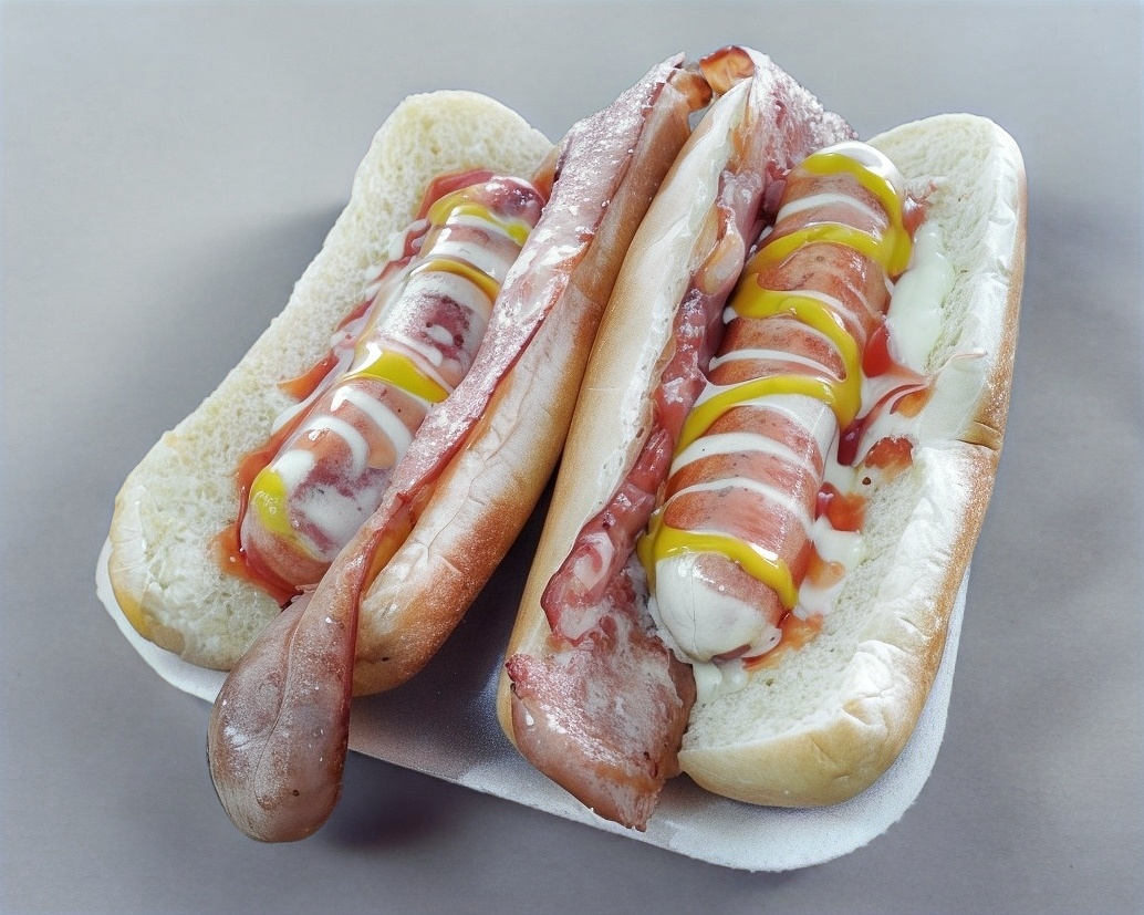 Pan, salchicha tocino y aderezos.