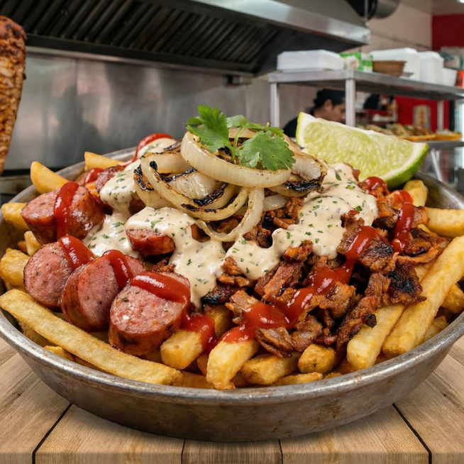 200 g de papas fritas salchicha en rodajas carne al pastorcebolla asada catsup aderezo y queso amarillolla asada catsup aderezo y queso amarillo