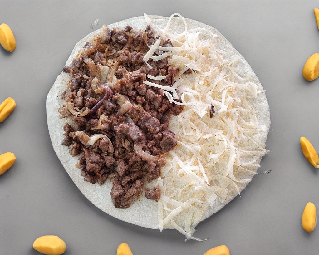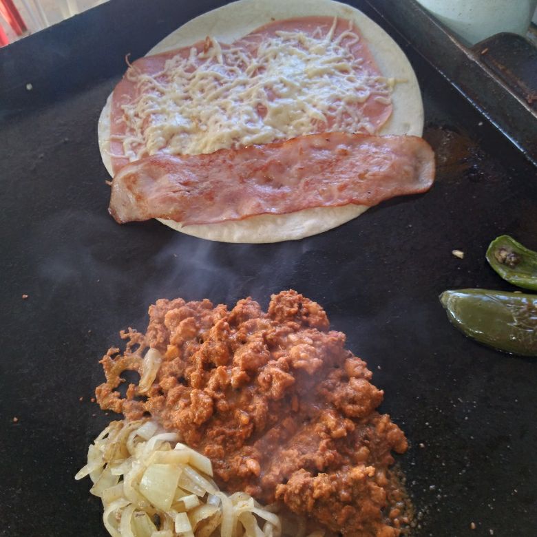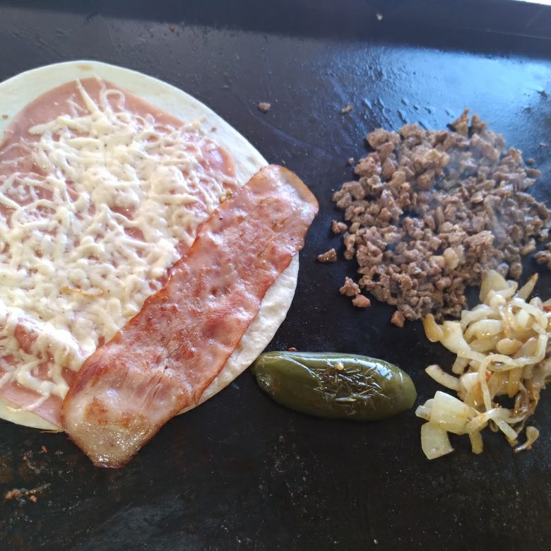 Carne de hamburguesa queso amarillo queso blanco excelsior salchicha,jamon y tocino picados aderezo de la casa en tortilla de harina