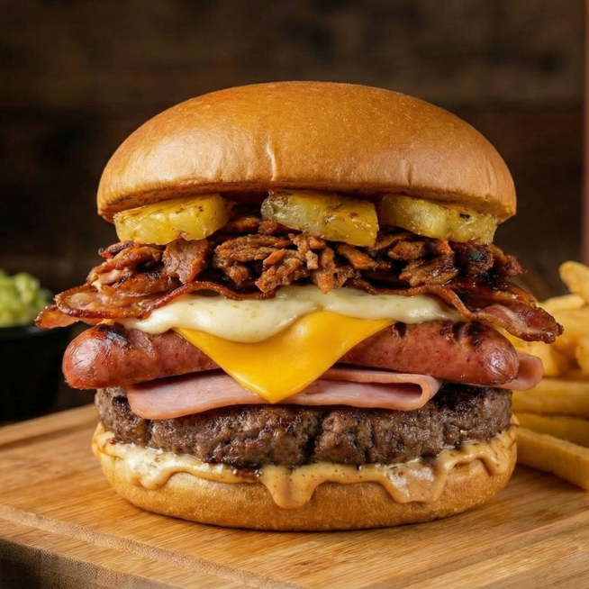 Doble carne casera doble jamón doble queso amarillo doble salchicha doble queso blanco excélsior doble tocino y piña