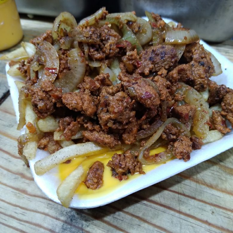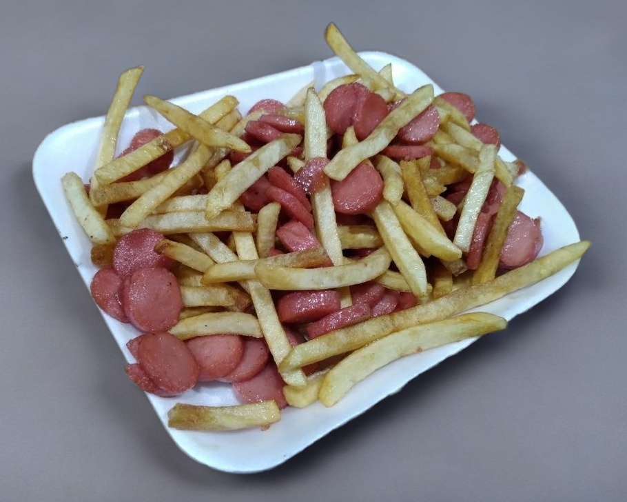 Orden de 200 g de papas fritas con salchicha en rodajas o salchicha roja para asar en cuadritos carne asada o al pastor a elegir bañados con abundante queso amarillo derretido