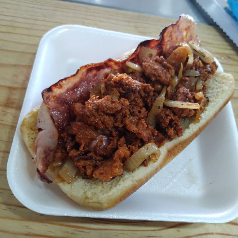 Pan salchicha tocino carne asada cebollita asada y aderezos