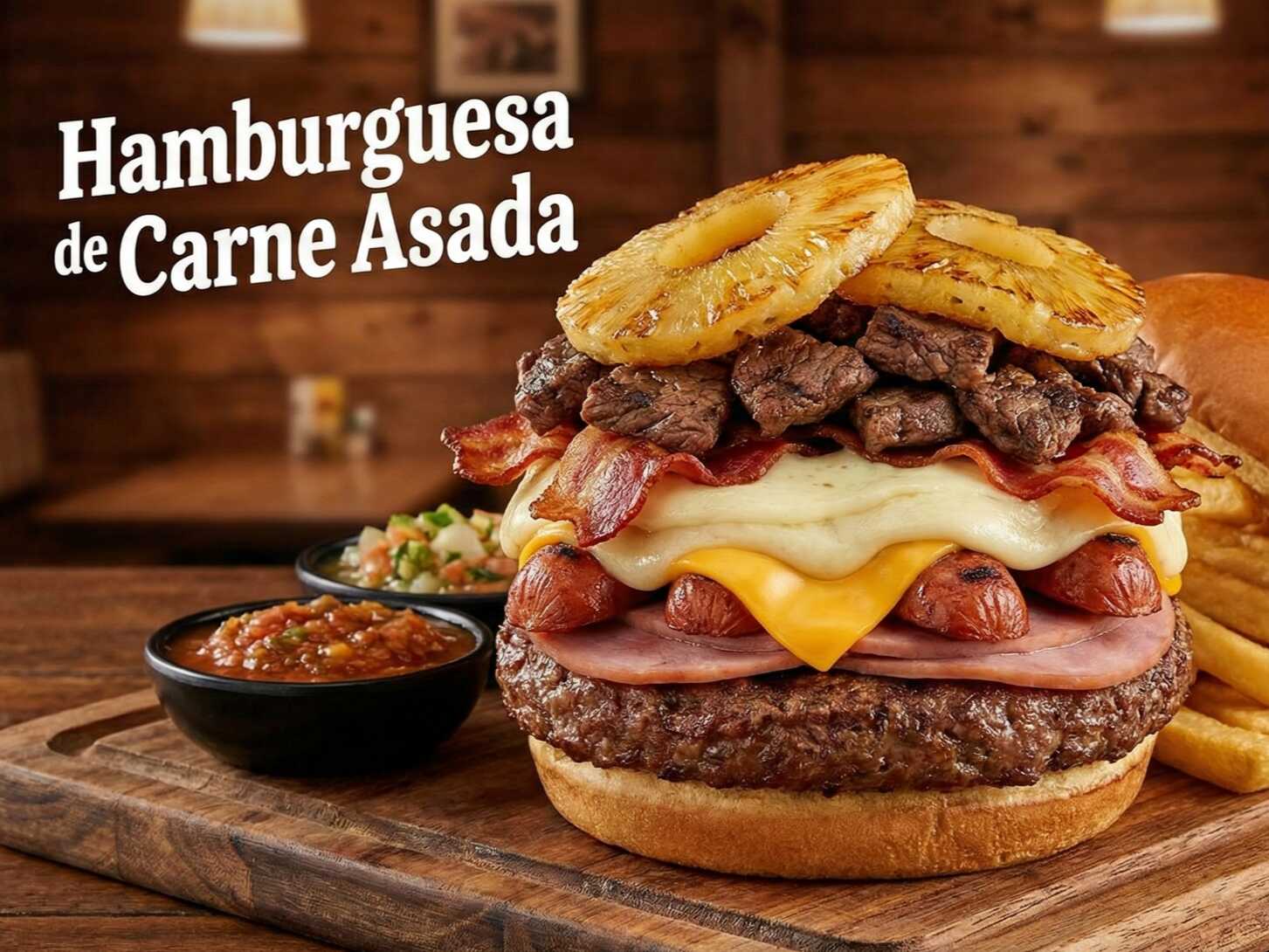 Doble carne casera más carne asada doble tocino doble jamón doble queso amarillo doble queso blanco excélsior doble salchicha y piña