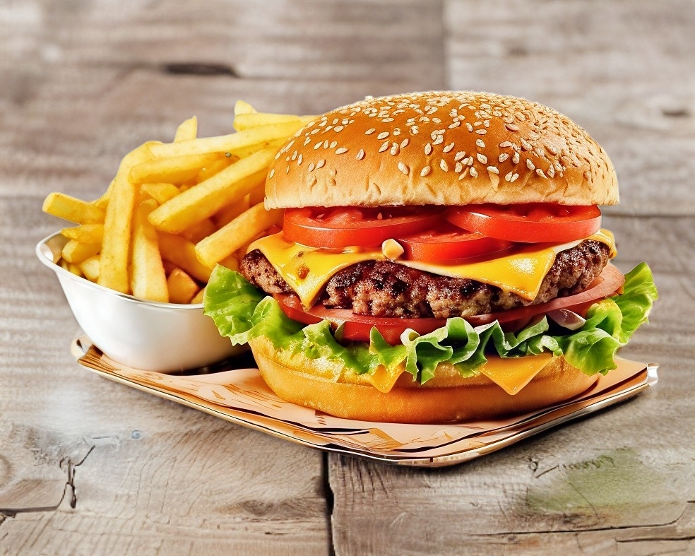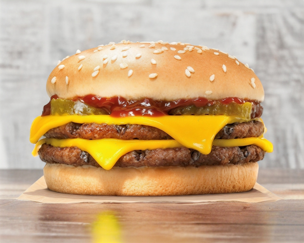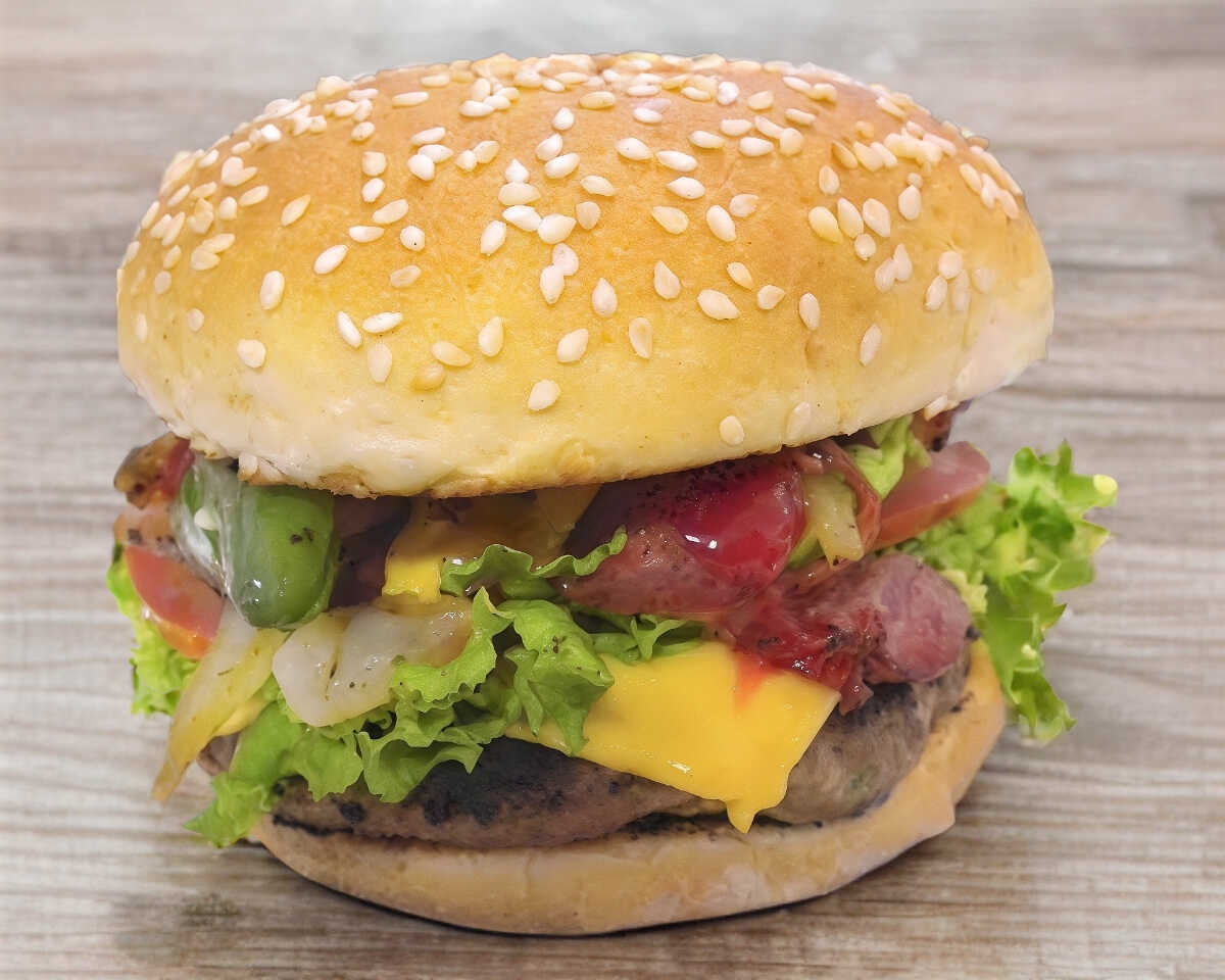 Doble carne, doble queso, doble jamon, lechuga, tomate, cebolla, chile captsu, mayonesa, mostaza