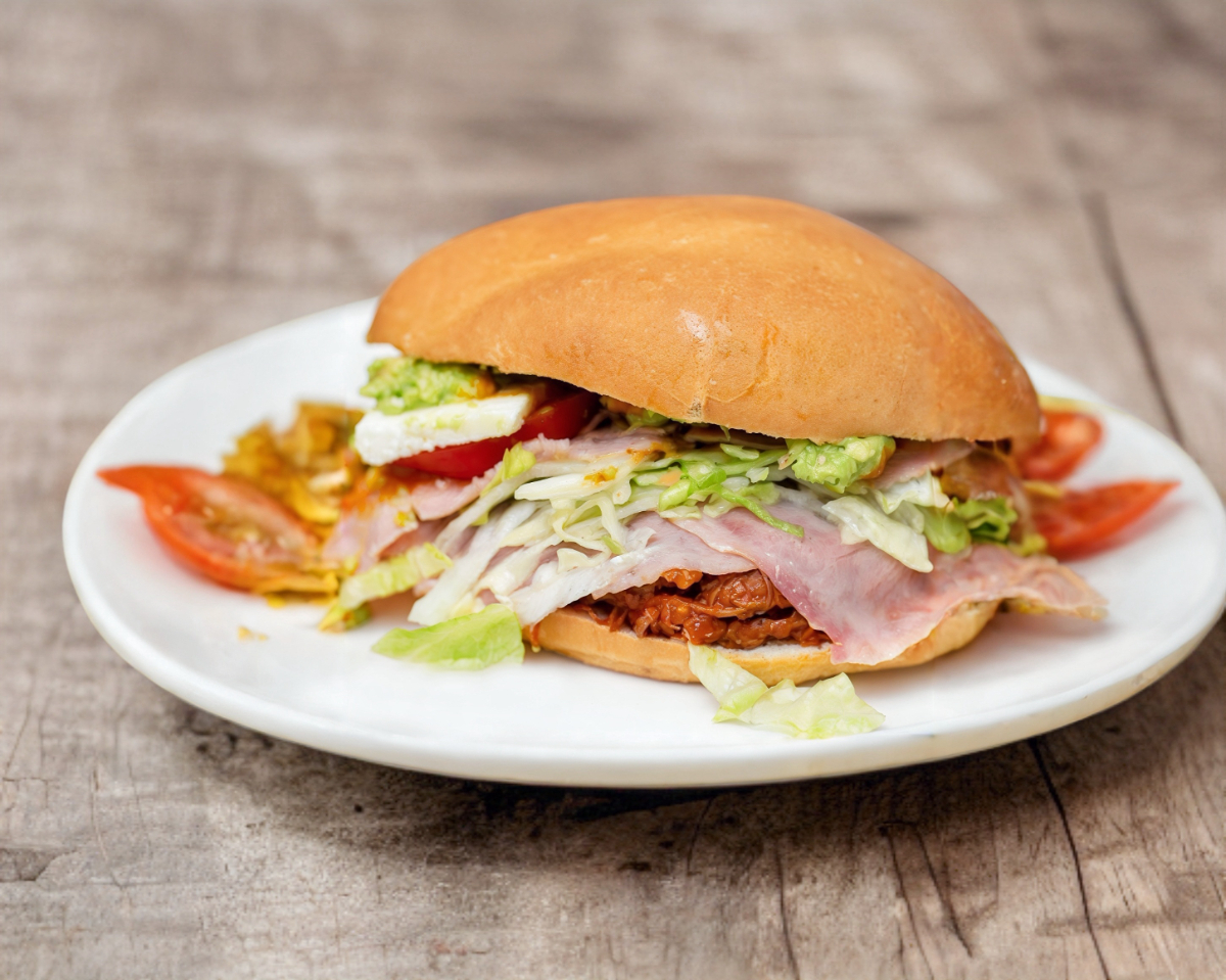 Delicioso pan frances aguacate, mayonesa, pierna, queso, jamon, lechuga, tomate, cebolla y chile