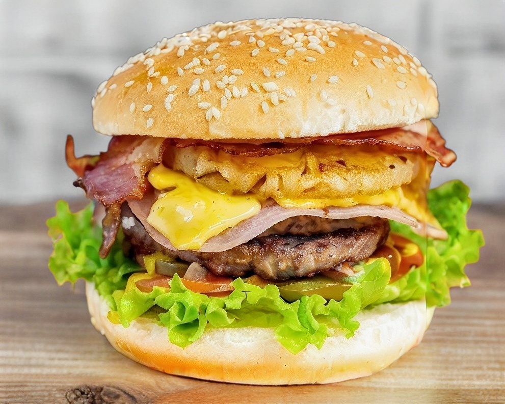 Doble carne, doble jamon, doble queso, piña, salchicha, tocino, lechuga.