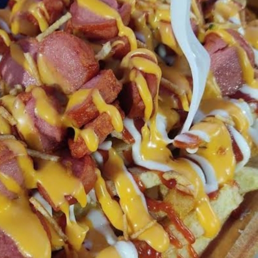 Charolita con Papás a la francesa con captsu, mayonesa,queso amarillo y salchicha