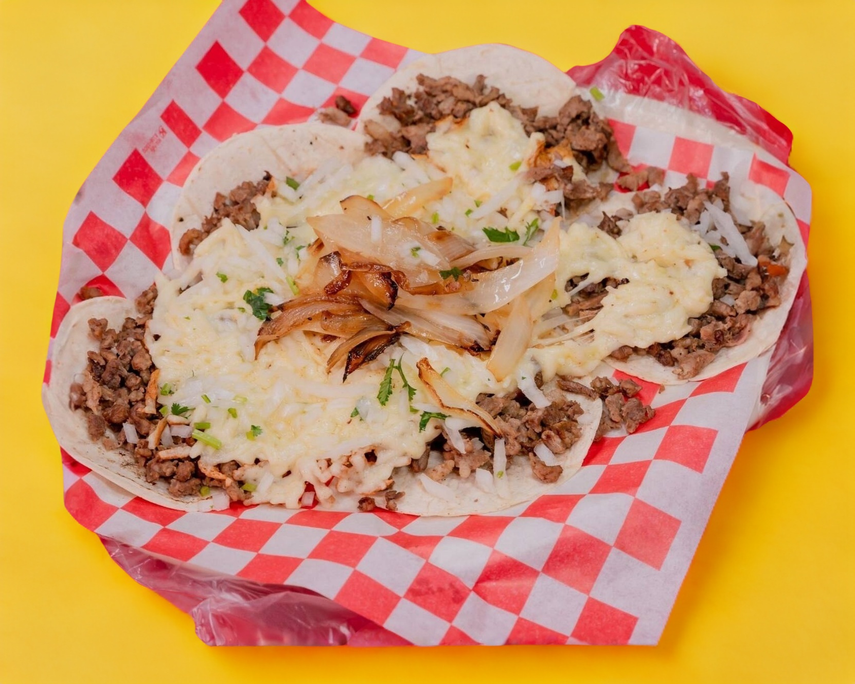 ORDEN CON 200 G DE CARNE, 145G DE QUESO, 5 TORTILLAS DE MAÍZ, CEBOLLA CRUDA Y ASADA, PEPINO FRESCO.
