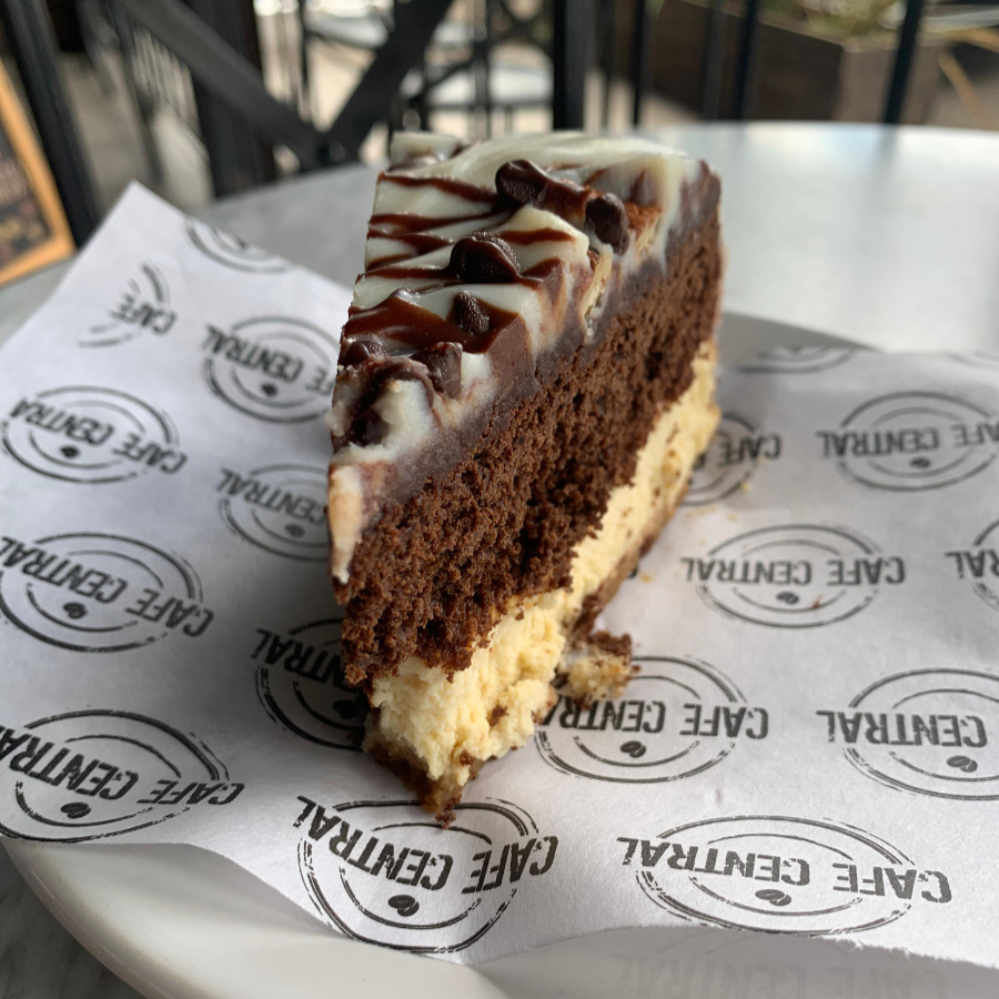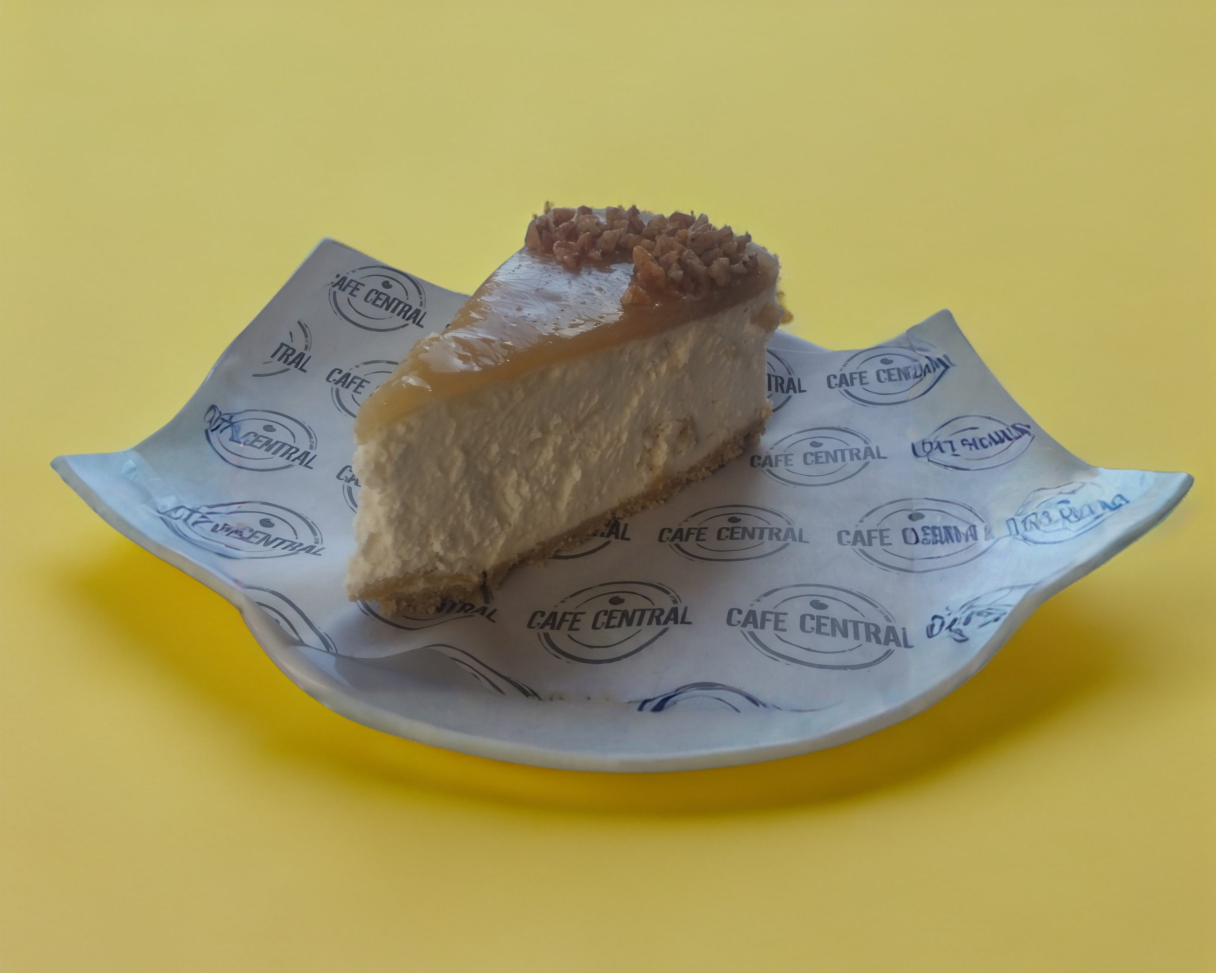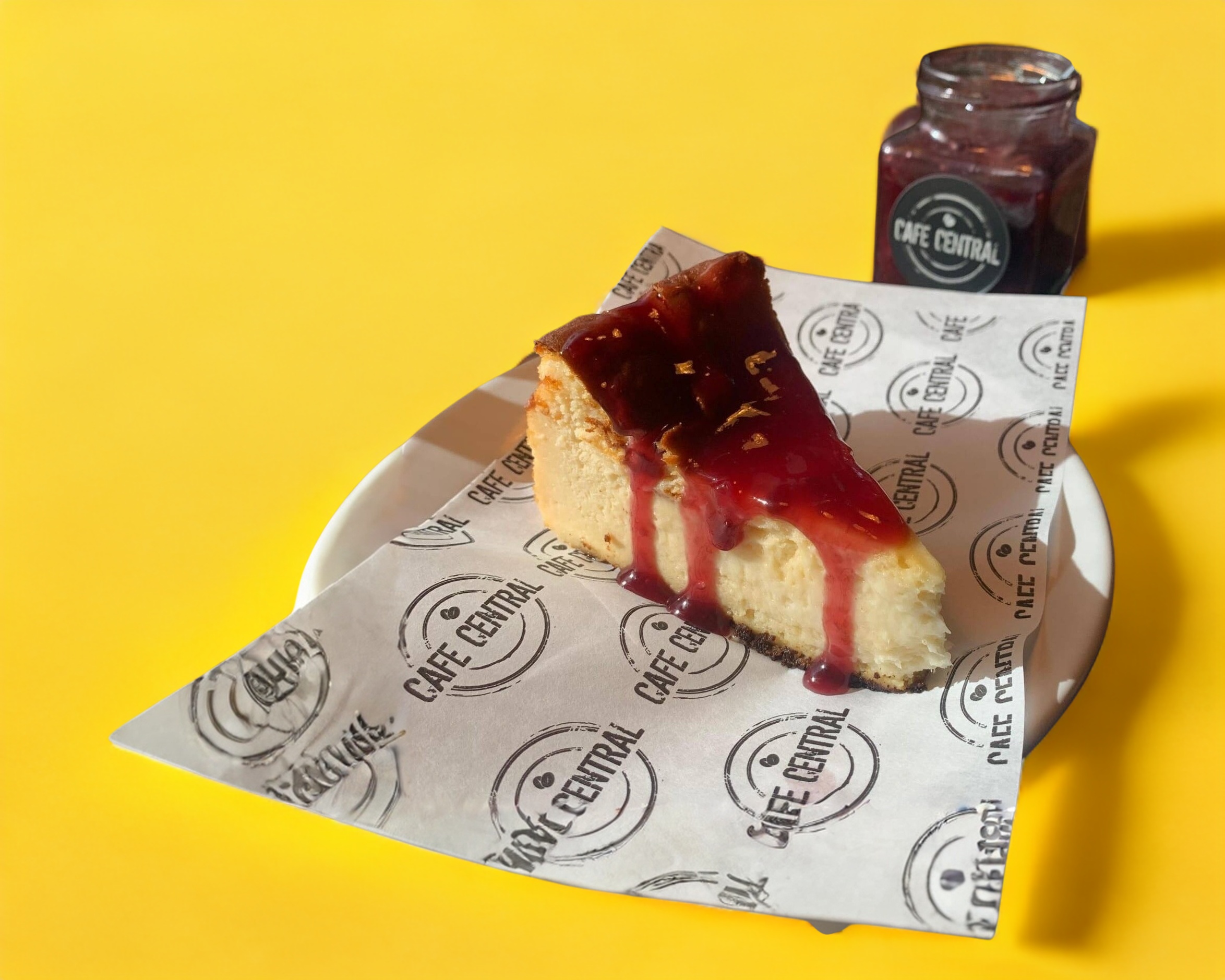 Suave y cremosa tarta de queso con sirope de cereza. Exclusiva de Café Central