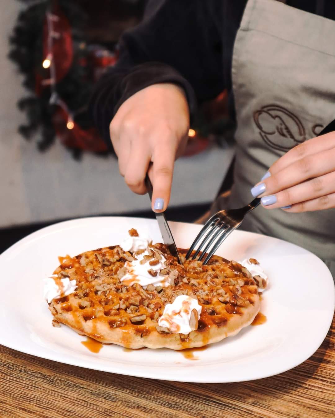 Delicioso waffle esponjoso bañado en cajeta, acompañado de nuez y crema batida.