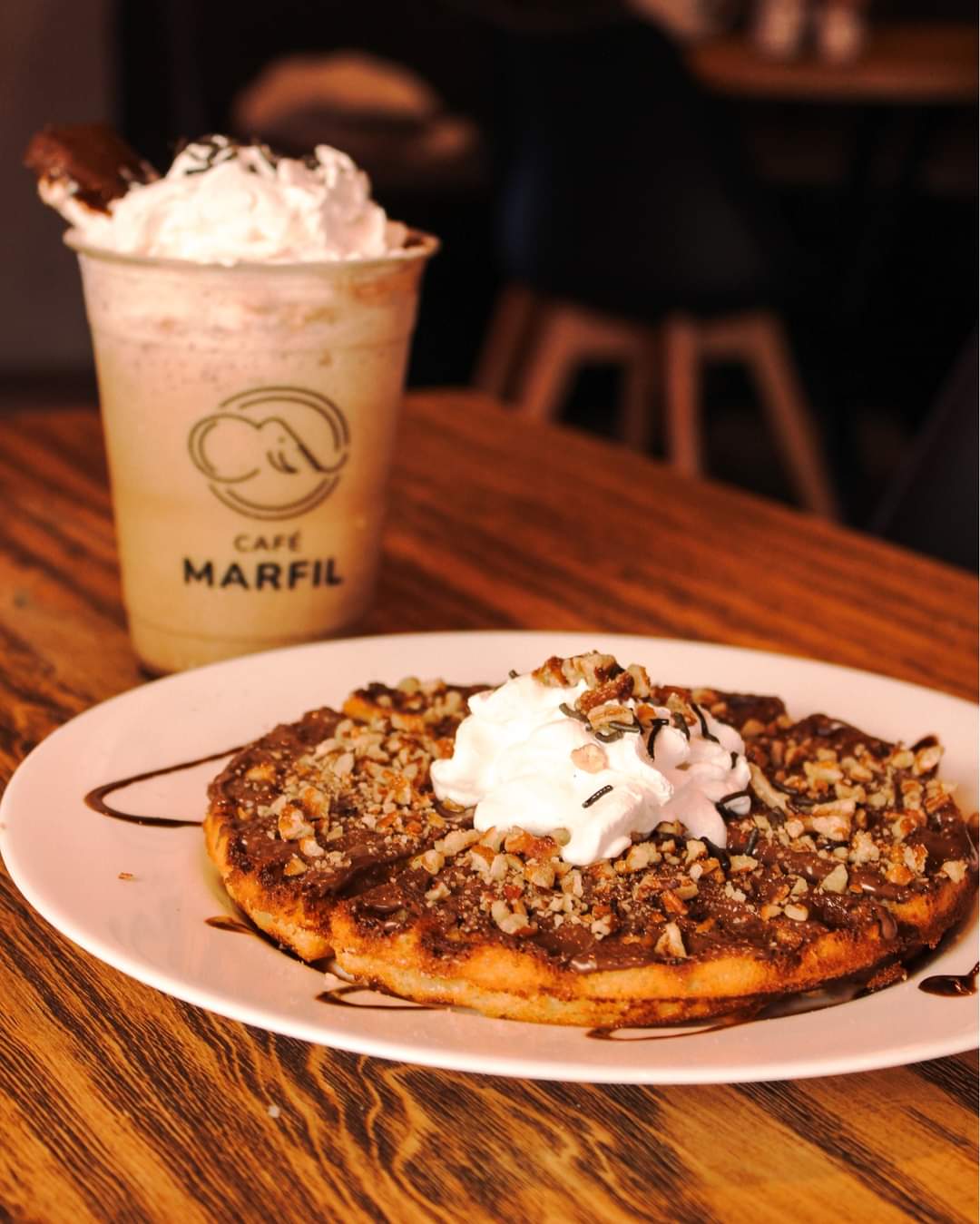 Delicioso waffle esponjoso cubierto con Nutella, acompañado de nuez y crema batida.