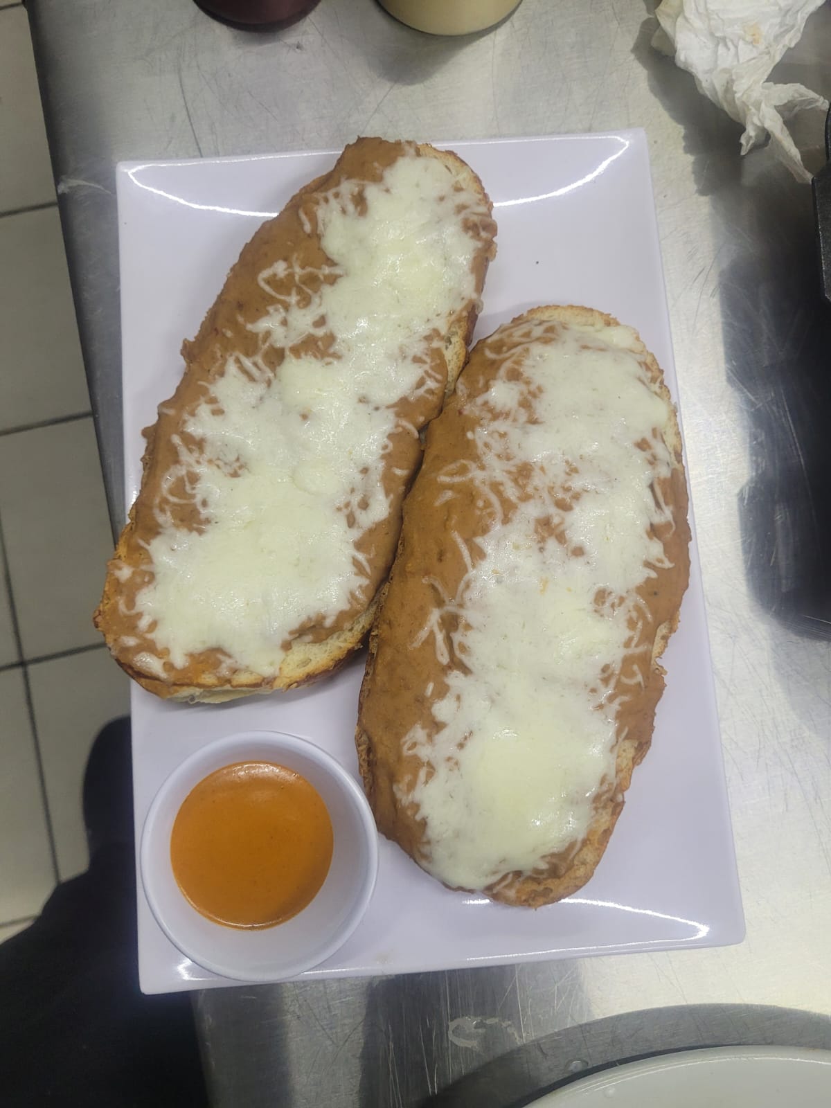 La combinación perfecta de pan pepito y frijoles refritos, coronados con una deliciosa capa de queso chihuahua gratinado, acompañado de nuestro aderezo de 3 chiles.