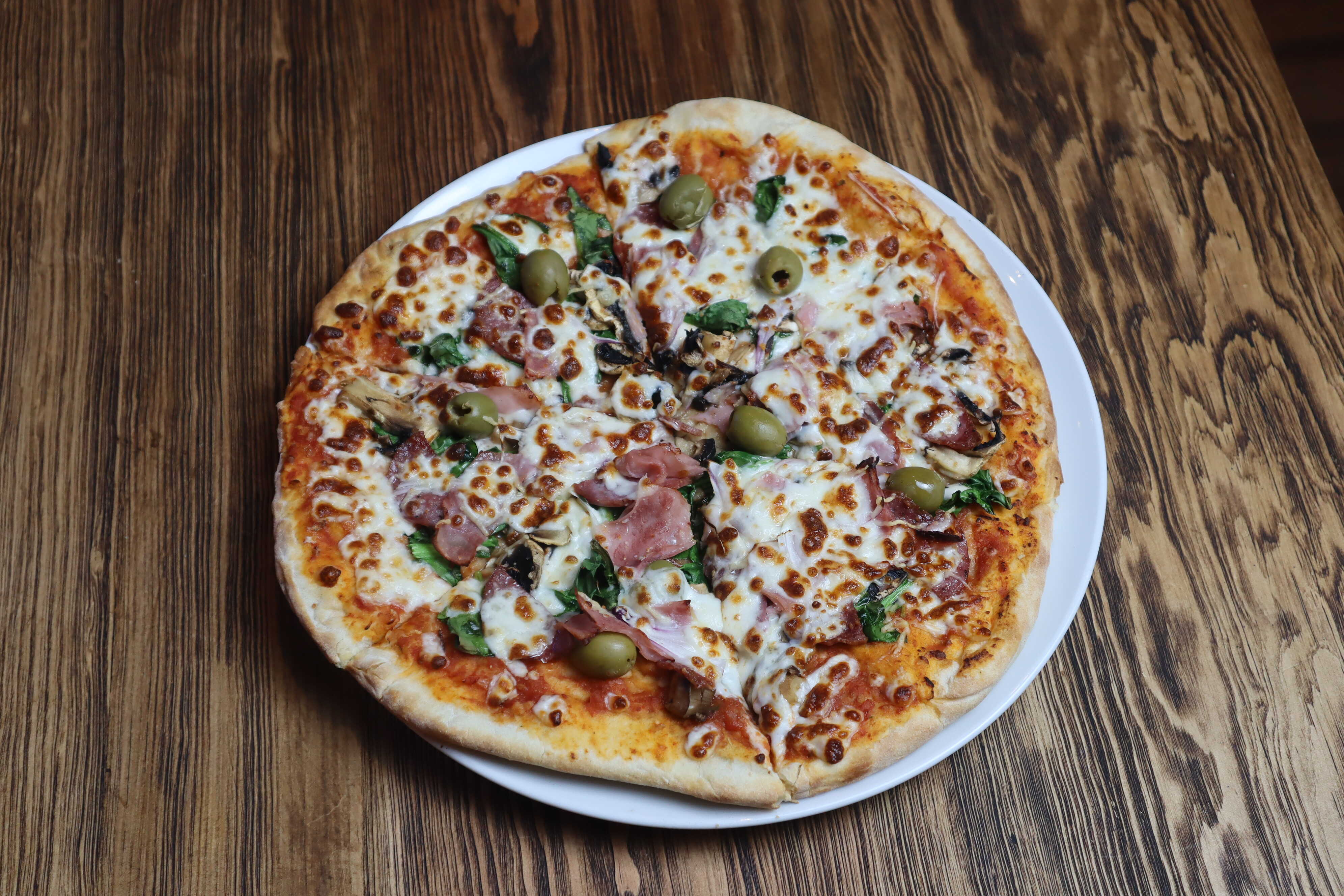 Salsa de tomate, champiñones, espinacas, aceitunas verdes, salami ahumado, jamón de pavo, queso parmesano y queso mozarella.