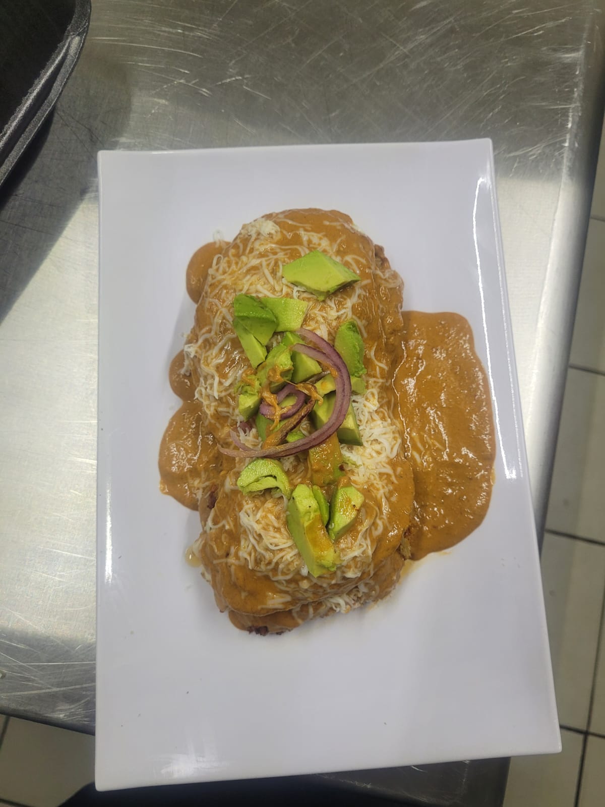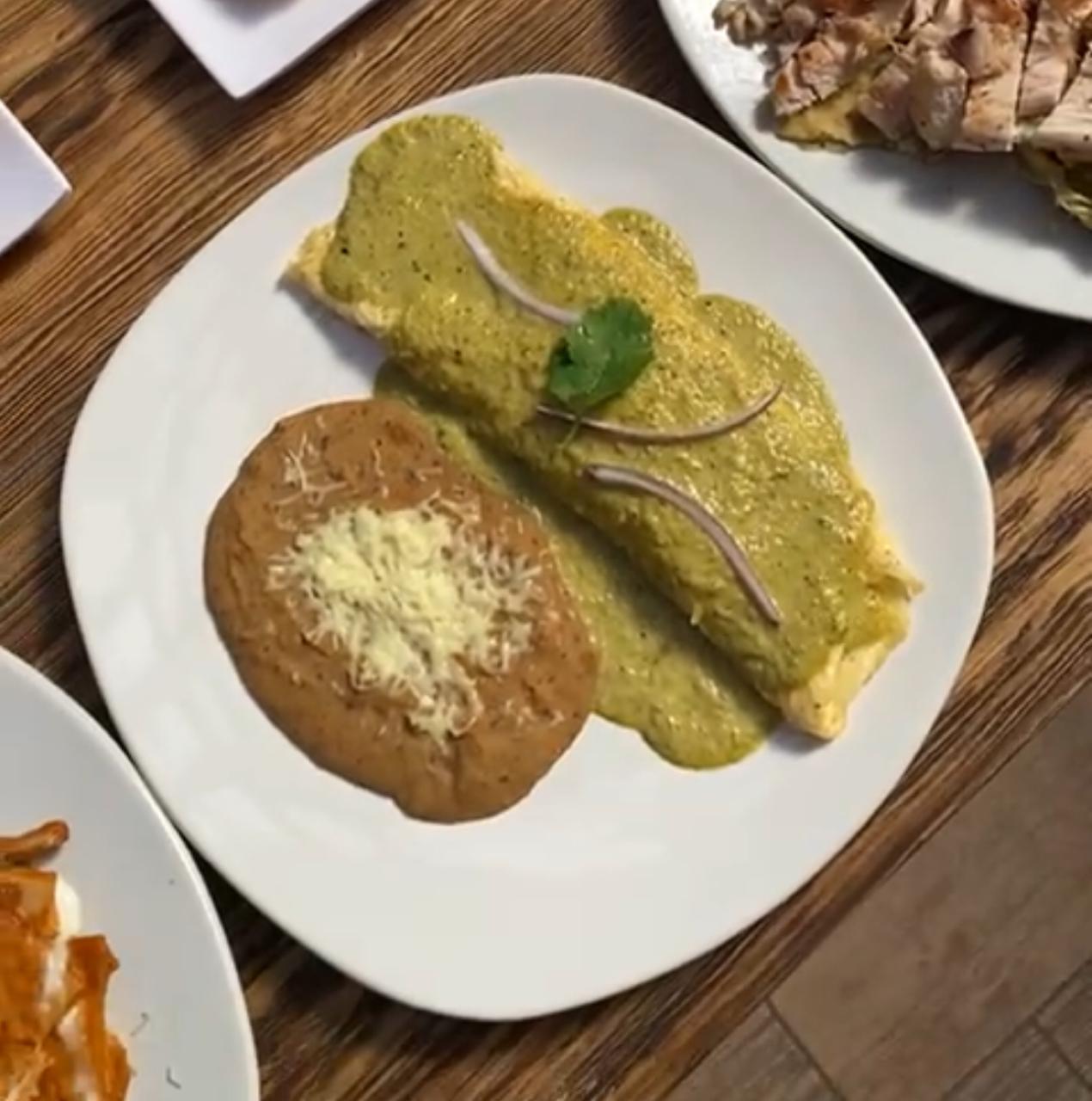 Relleno de queso chihuahua, espinacas y cebollas salteadas, bañado de nuestra tradicional salsa poblana y acompañado de frijoles redritos.