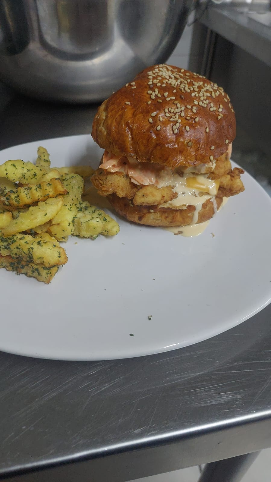Deliciosa pechuga de pollo empanizada, mantequilla de finas hierbas y nuestro aderezo especial con zanahoria rallada y cebolla morada, acompañada de una porción de papas a la francesa.