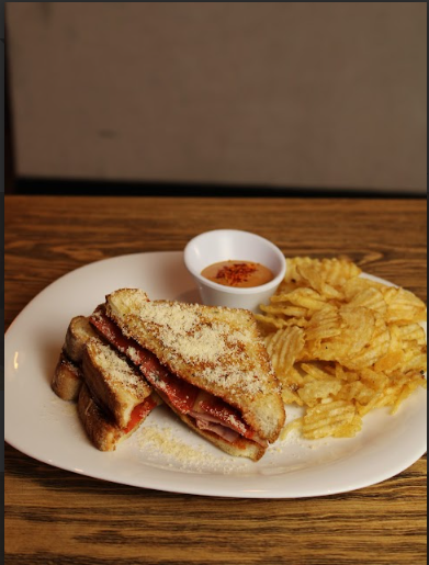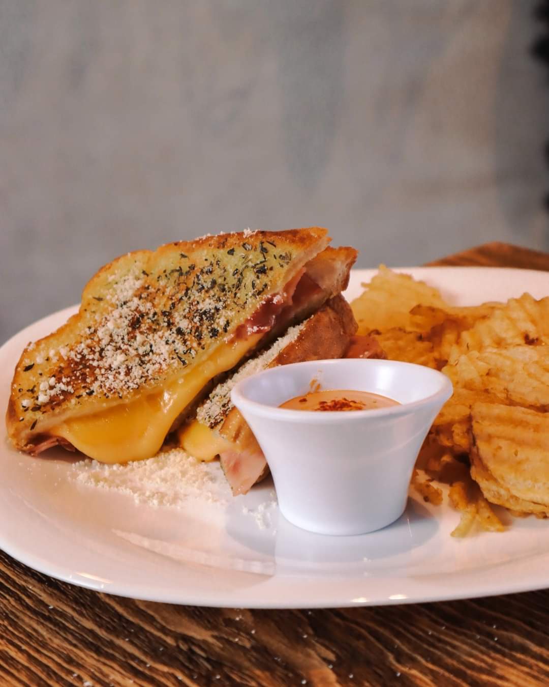 Pan tostado a la plancha con mantequilla de finas hierbas, la combinación perfecta se encuentra en este sándwich con 3 quesos, queso philadelphia, queso americano y queso manchego, jamón de pavo, acompañado de chips de papas fritas y nuestro aderezo chipotle.