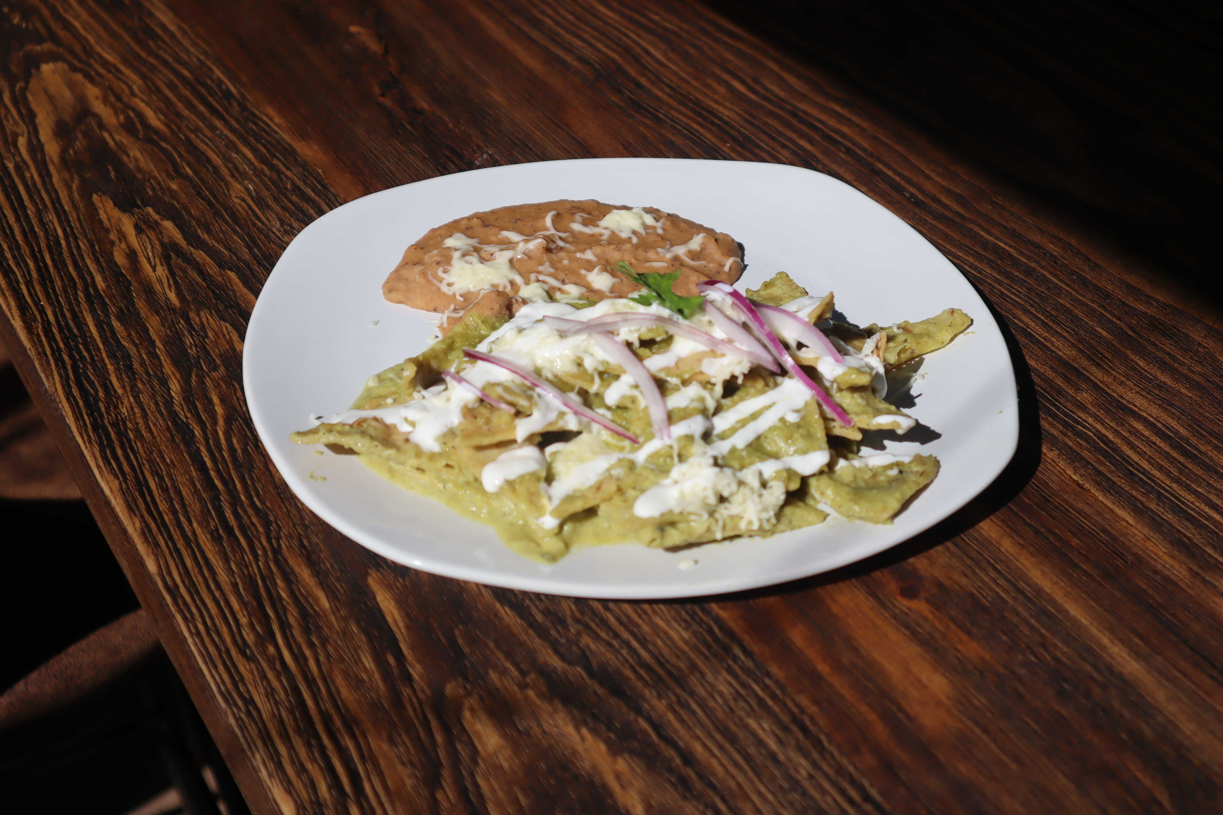 Tortillas de maíz crujientes bañadas en salsa a tu elección, acompañada de frijoles refritos y por encima una deliciosa capa de queso.