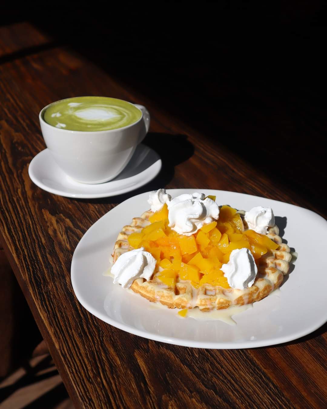 Delicioso waffle esponjoso bañado en lechera con duraznos y crema batida.