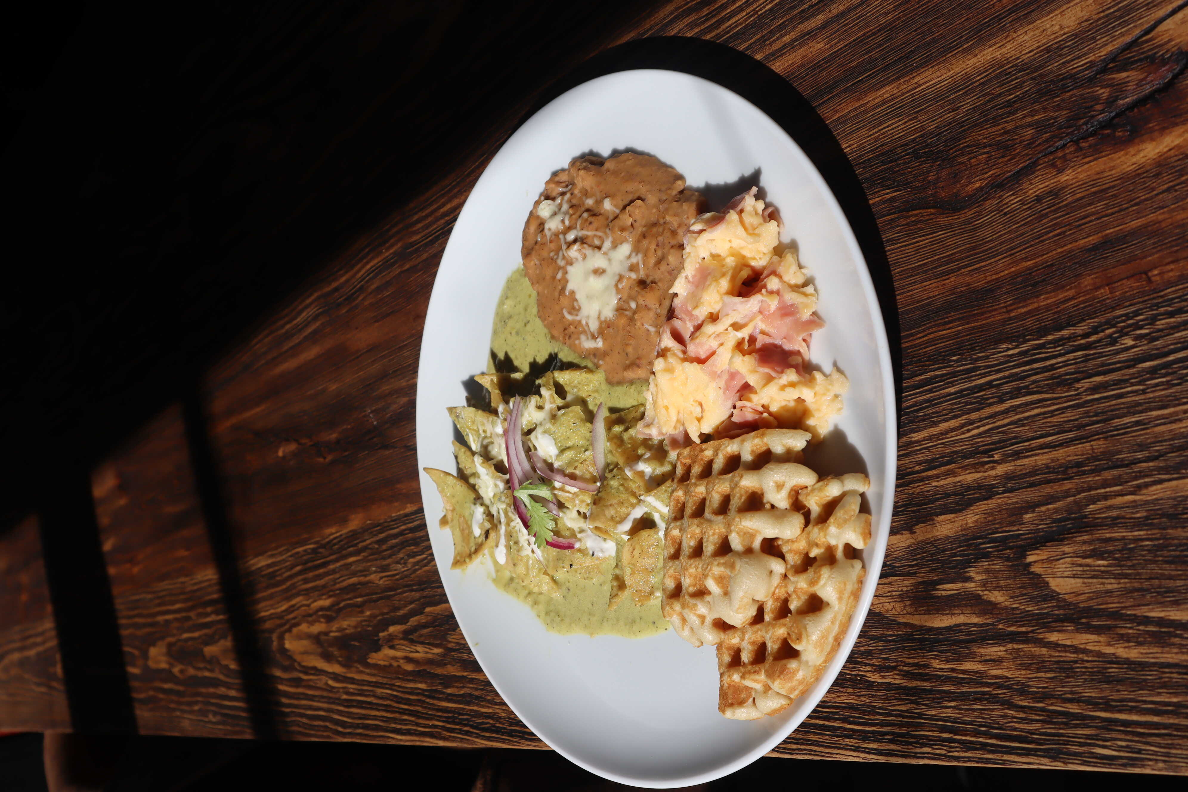 2 Huevos estrellados o revueltos con el ingrediente de tu elección, frijoles refritos y 1/2 porción de chilaquiles, acompañado de delicioso waffles.