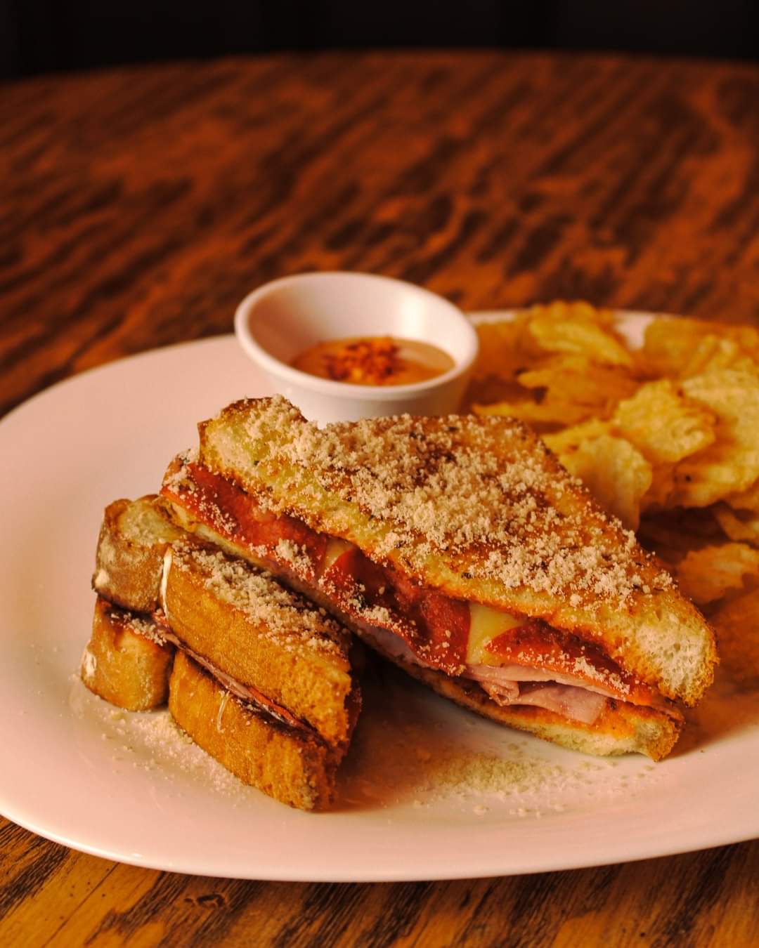 Pan tostado a la plancha con mantequilla de finas hierbas, salsa de tomate, pechuga de pavo, queso manchego y pepperoni, acompañado de chips de papas fritas y nuestro aderezo de chipotle.