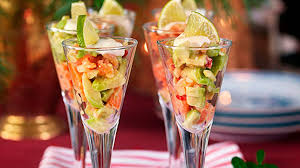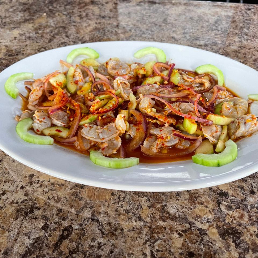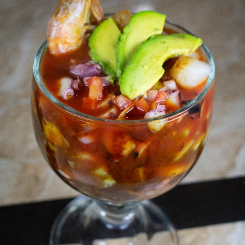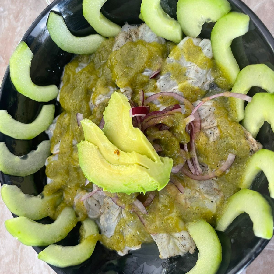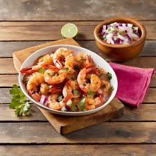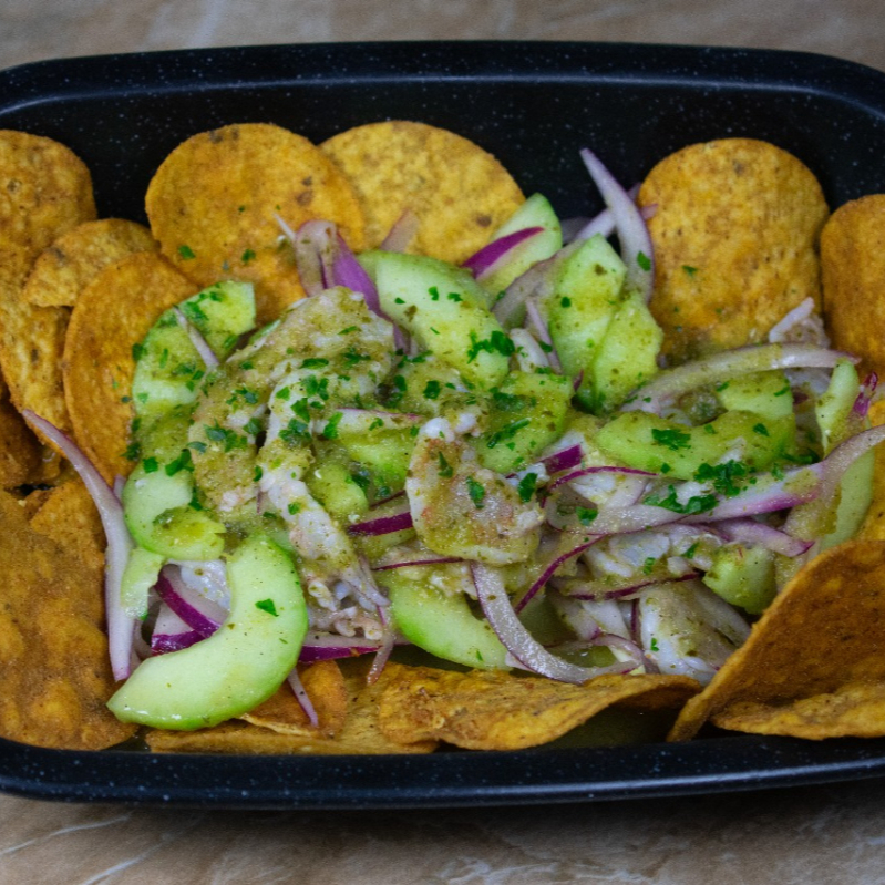 Camarón curtido en limón acompañado de pepino y cebolla con salsa a tu elección
