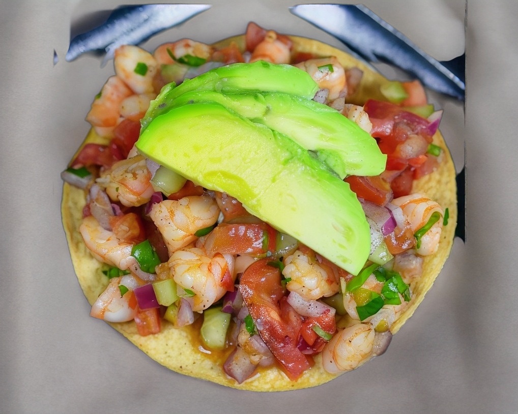 tostada con ceviche de pescado, camarón cocido y pulpo