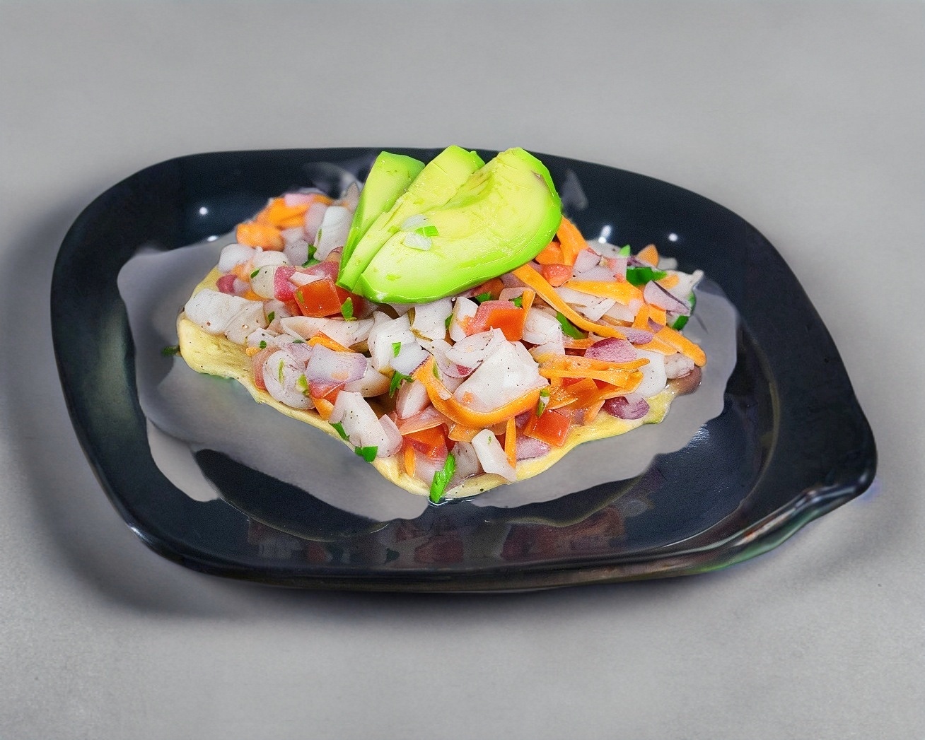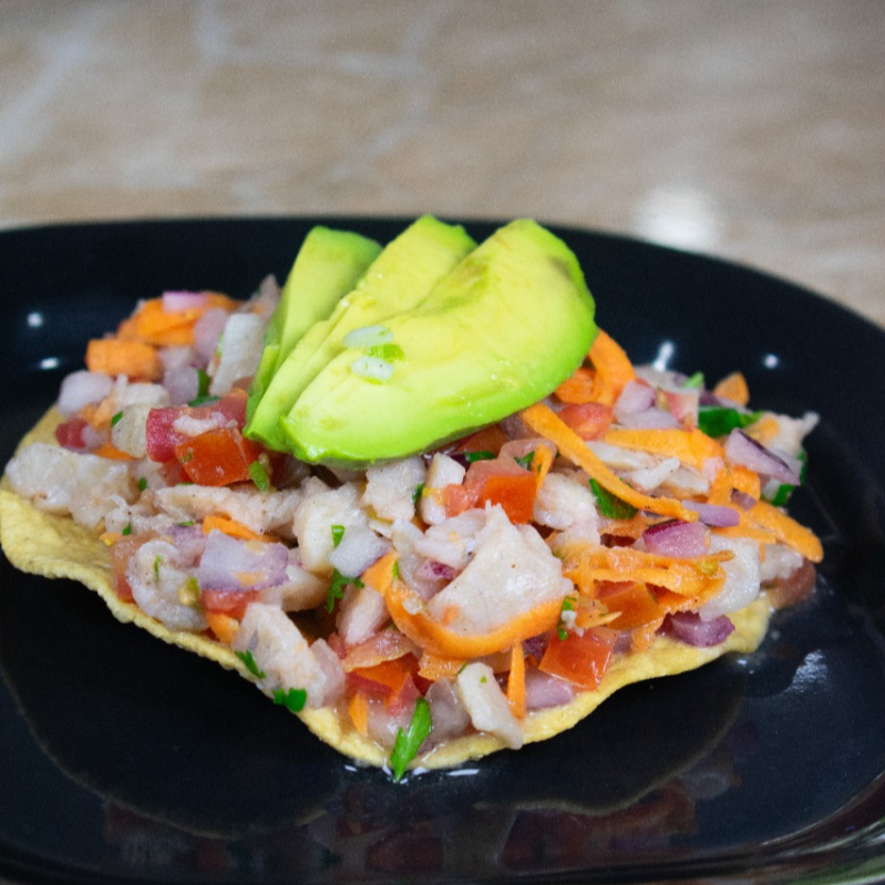 tostada con pescado curtido en limón, tomate, cebolla, zanahoria y cilantro.