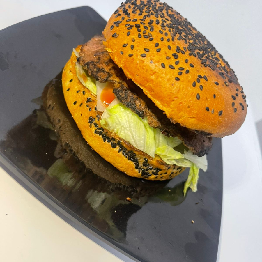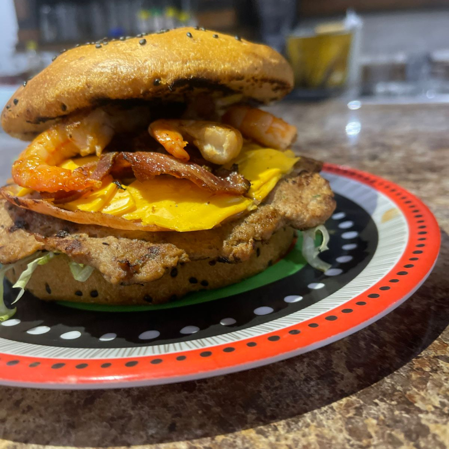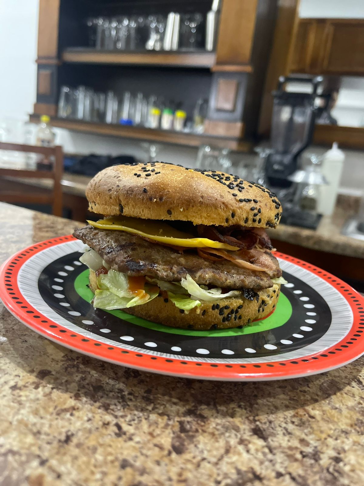 Carne de res, tocino queso y jamon, lechuga, tomate y aderezo de la casa.
