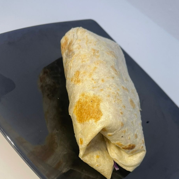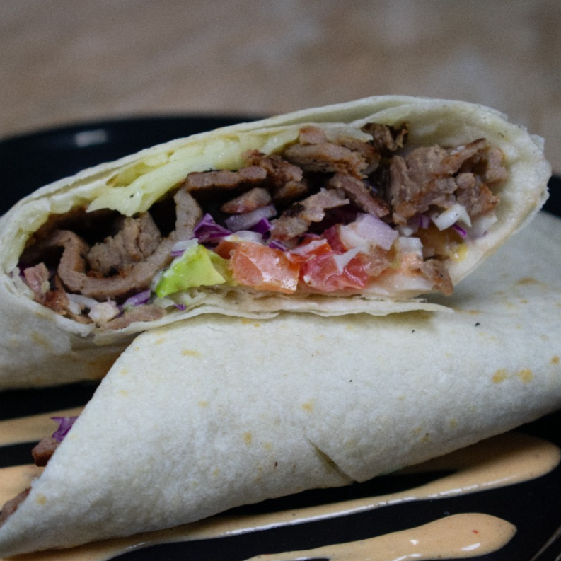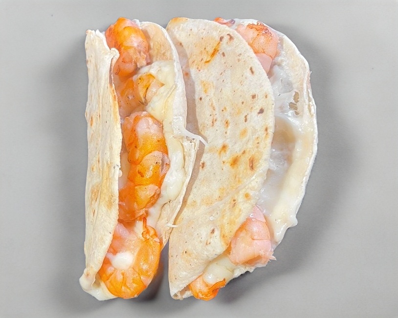 Tortilla de harina con camarón, carne asada, ensalada, aguacate y mayonesa.