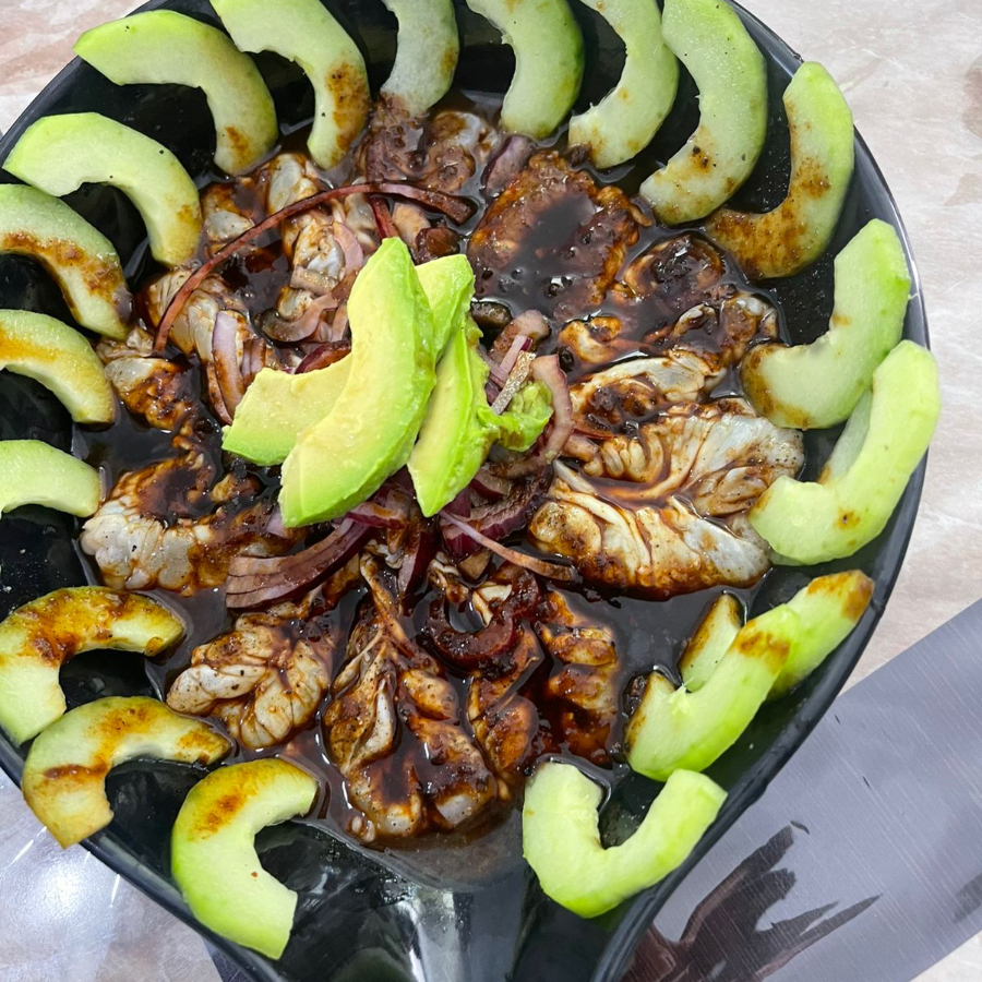 Tostada con camarón cocido y pulpo coronada con aguacte