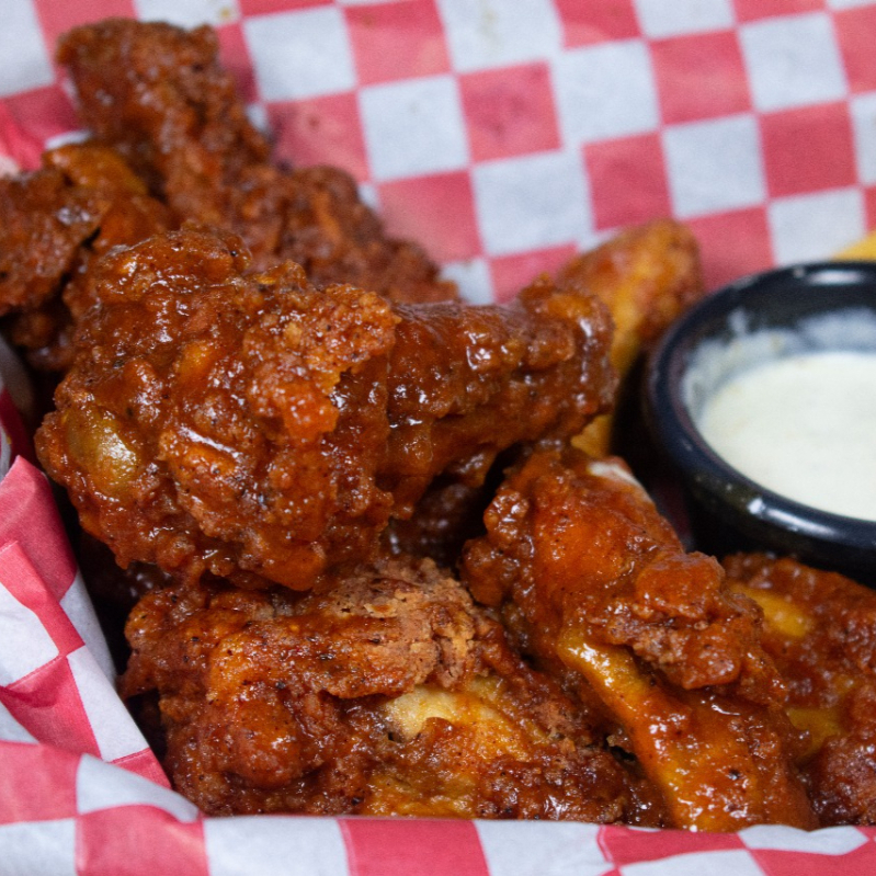 Alas y muslos de pollo servidos con salsa (BBQ, búfalo o mango habanero) servidas con zanahoria, apio y aderezo ranch.