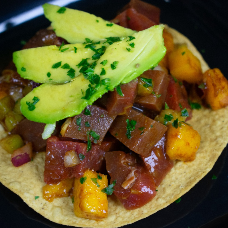 tostada con atún en cubos, mango, pepino, cebolla, cilantro aderezado con salsa negra de la casa