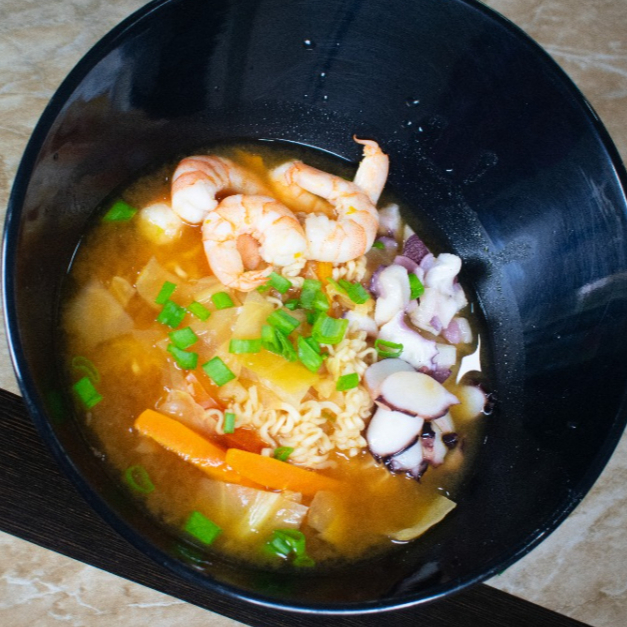 Ramen acompañado de camarón, calamar, zanahoria y repollo