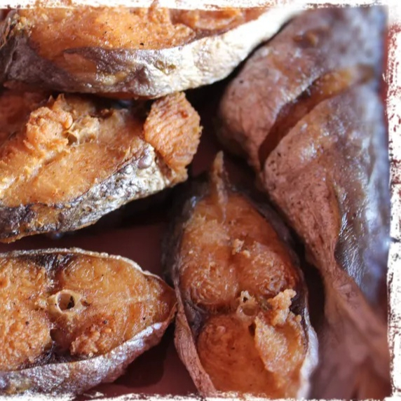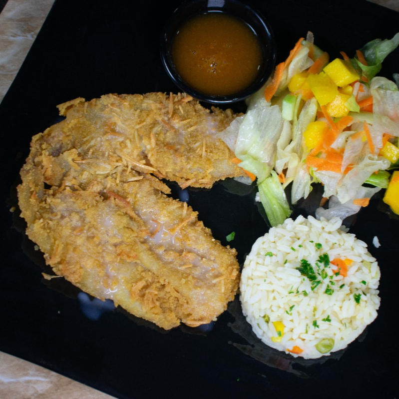 Plato de sierra crujiente acompañada de salsa de la casa.