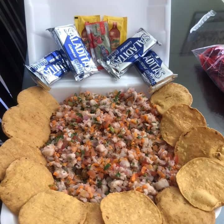 Ceviche de pescado, camarones, pulpo y callo acompañado de tostitos.