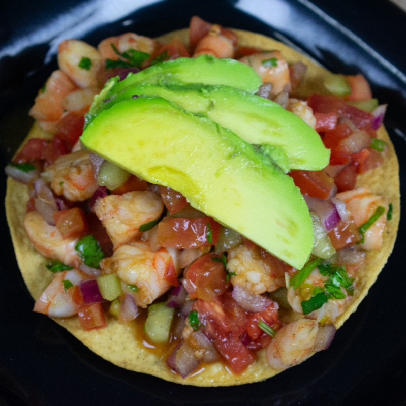 tostada de camarón cocido con pepino, tomate, cebolla y cilantro aderezada con salsa negra de la casa